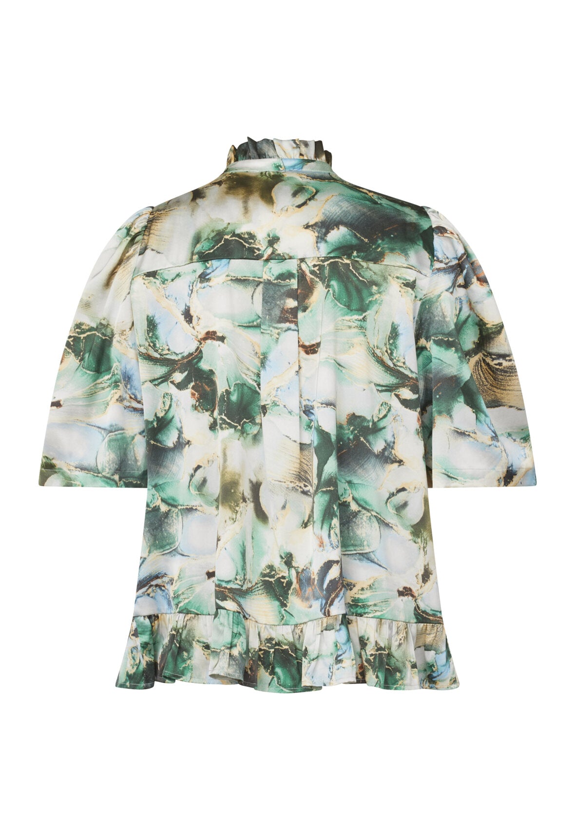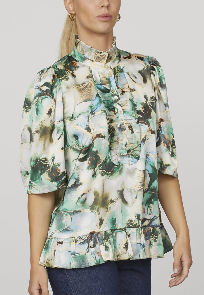 kort løstsiddende bluse med et fint marmorprint fra Love & Divine. blusen har albuelange ærmer, peplum forneden og en kort knaplukning med feminine flæser.