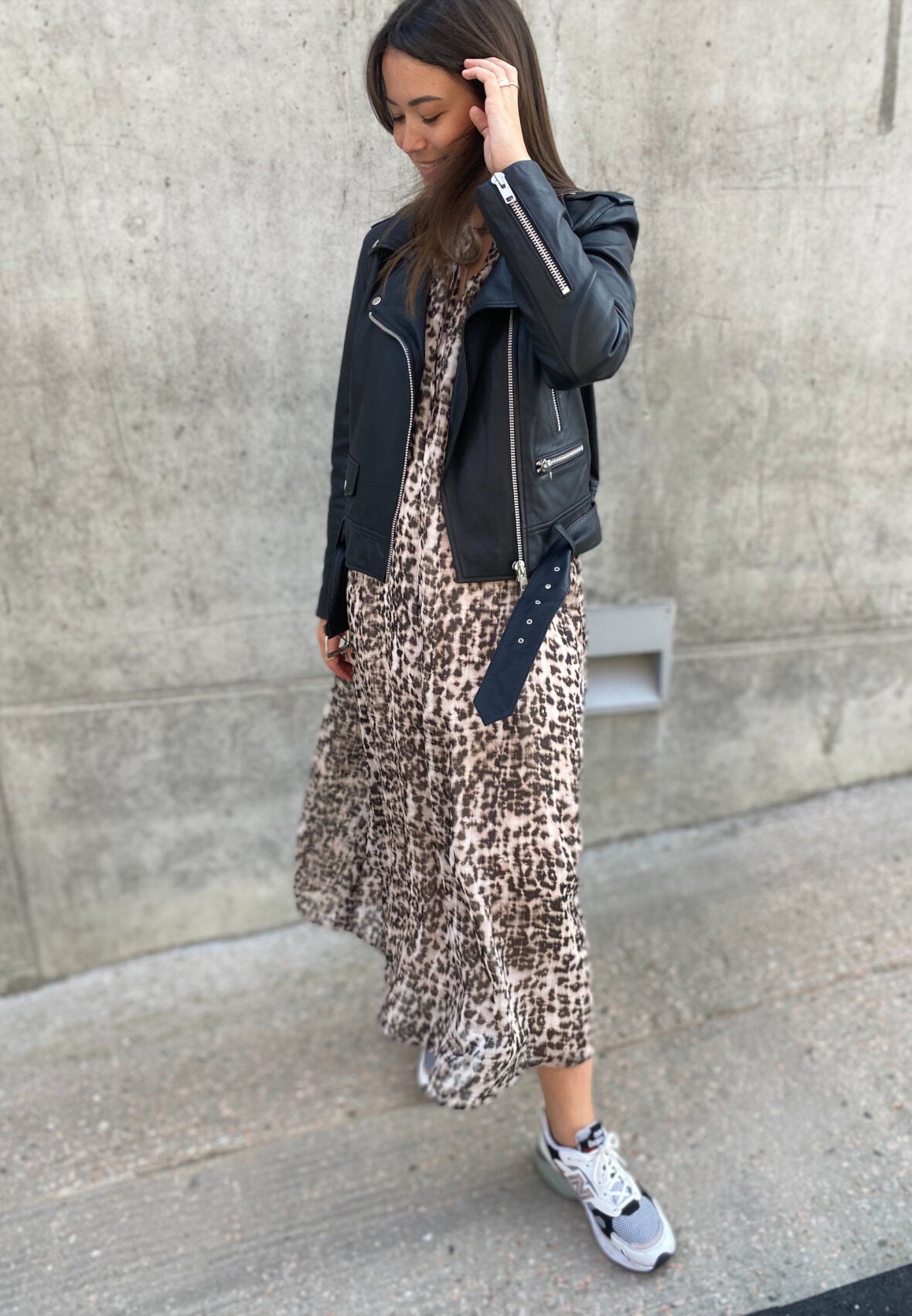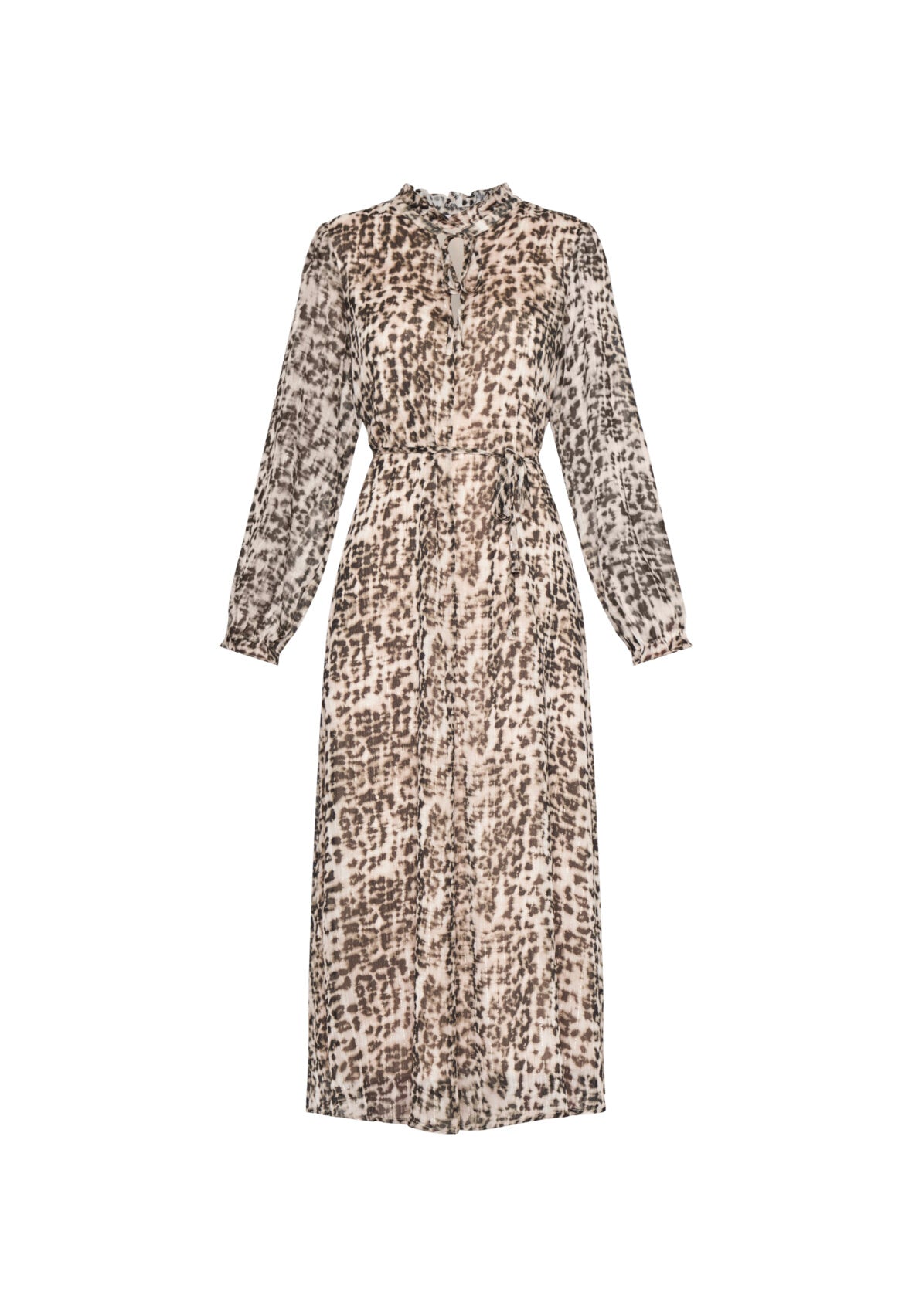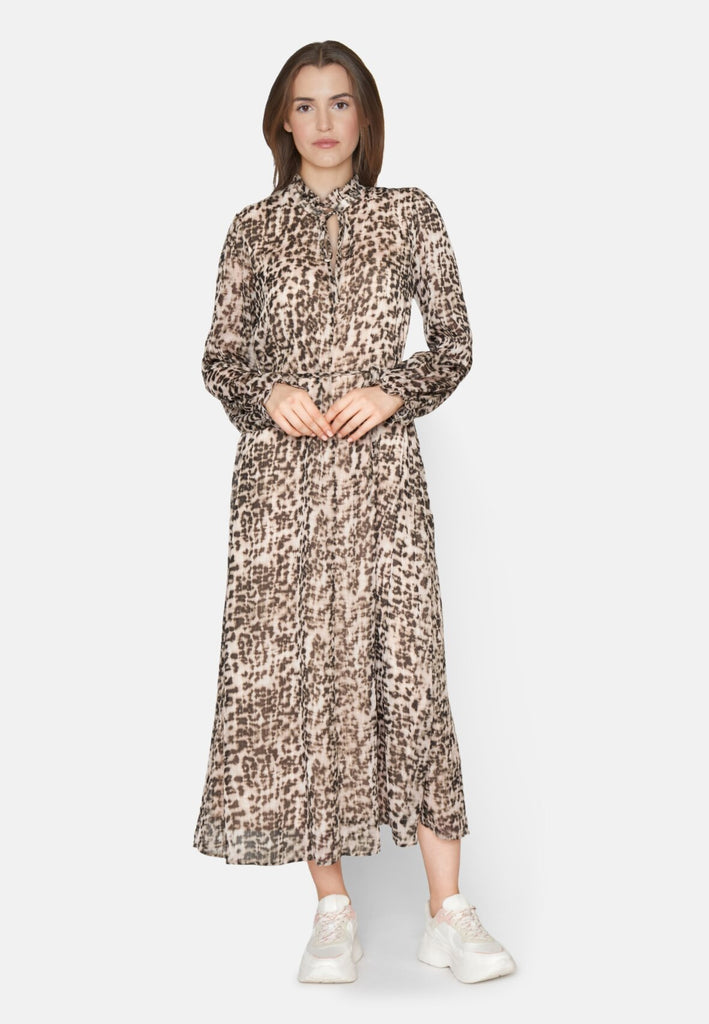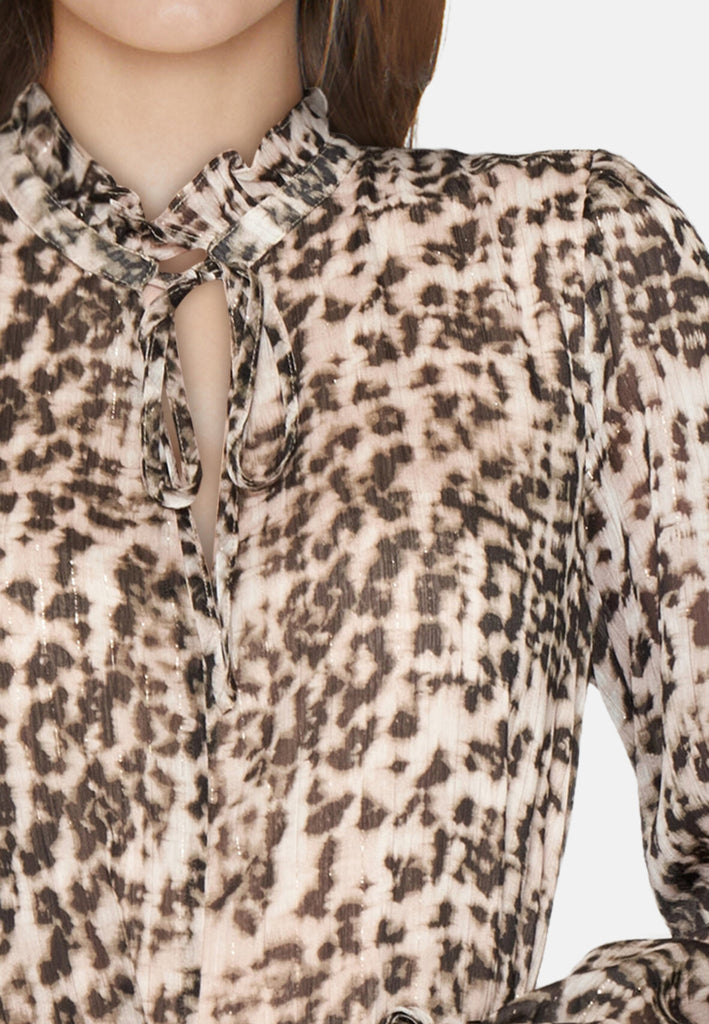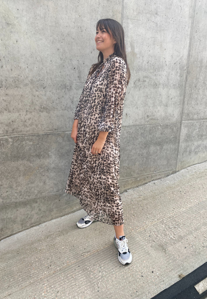 Den smukkeste kjole i leopard print med helt tynde guldtråde i striber. Kjolen har en løs pasform, bindebånd i halsen, samt en v-udskæring og bløde elastikker ved håndledet. Til kjolen medfølger et bindebånd, som man kan vælge at bruge i taljen, men også sagtens kan undvære.