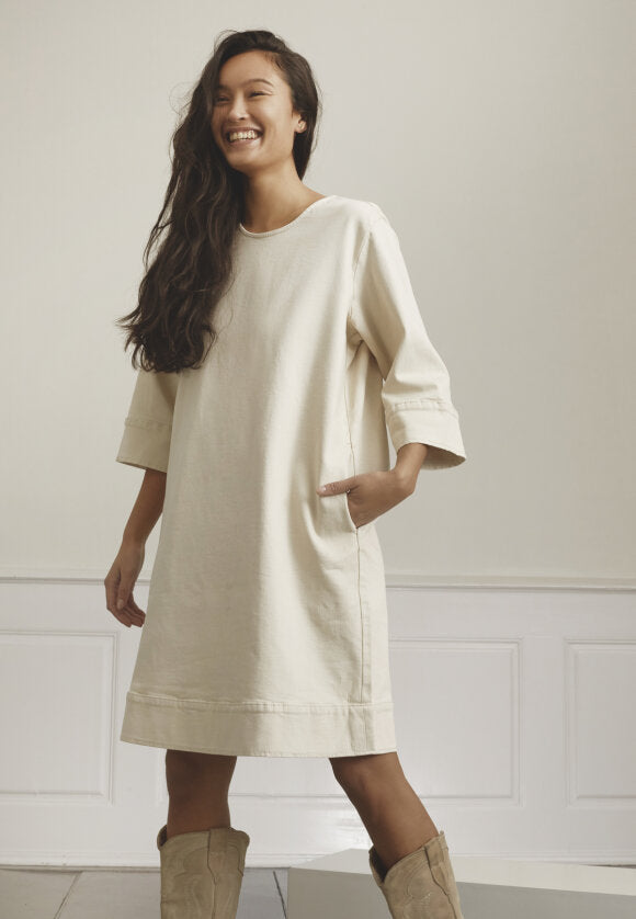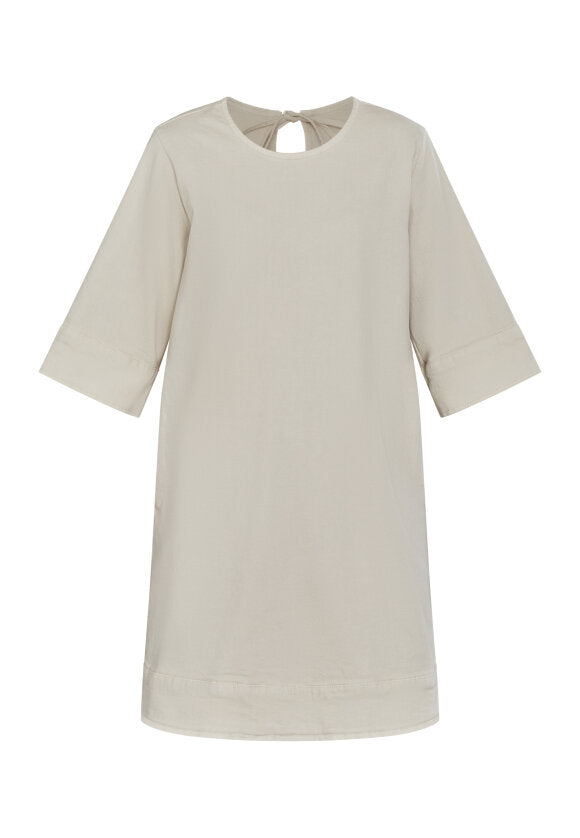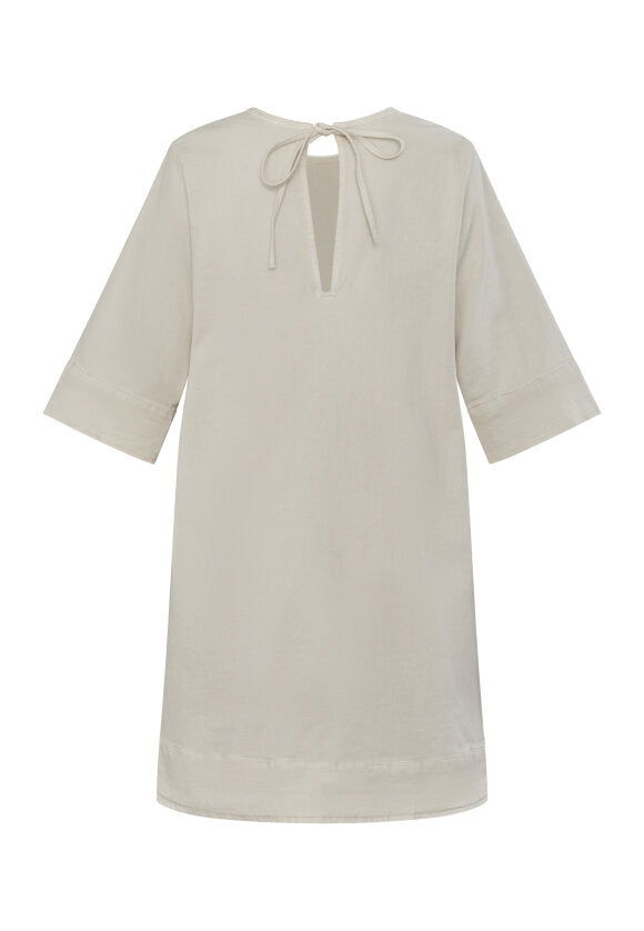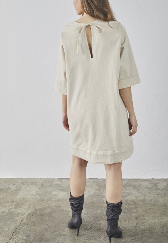 Skøn denimkjole i en lys sandfarve fra Love & Divine. Kjolen har en løs pasform, korte ærmer og en fin bindedetalje bagtil.