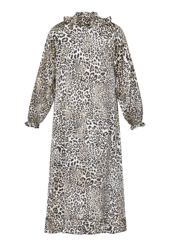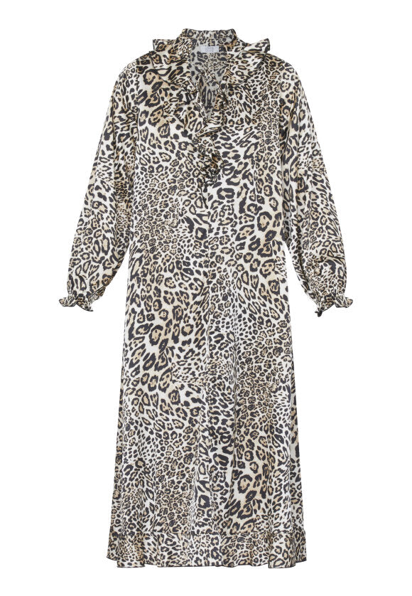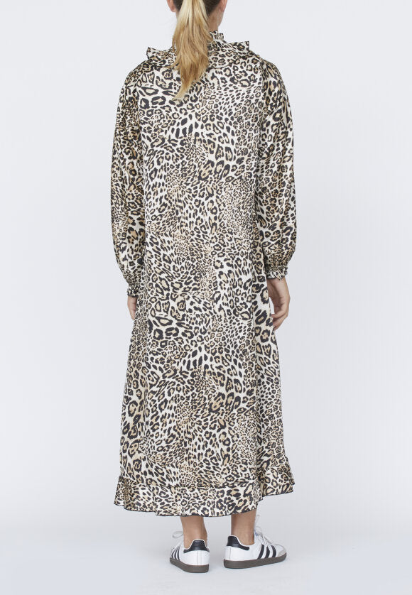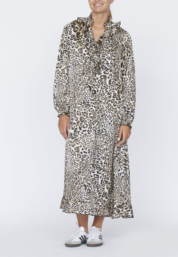 Cool lang leopardprintet kjole fra Love & Divine. Kjolen har en løs pasform og er med feminine flæser.
