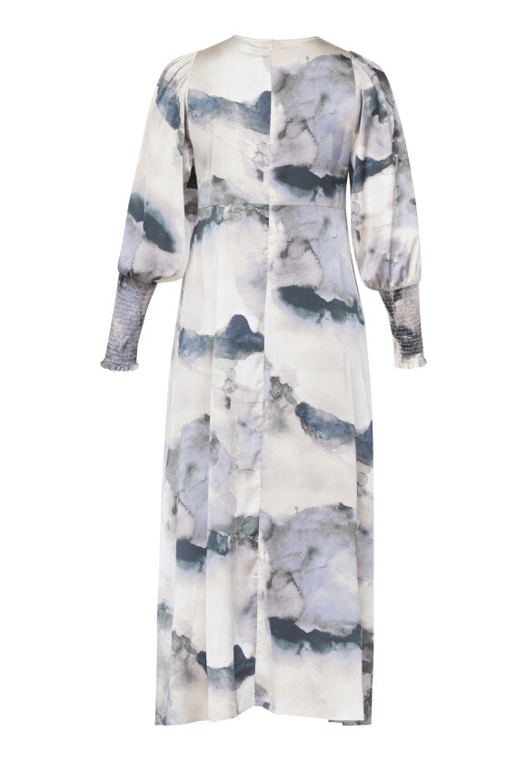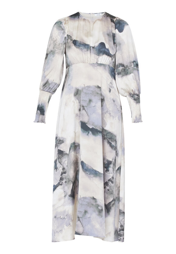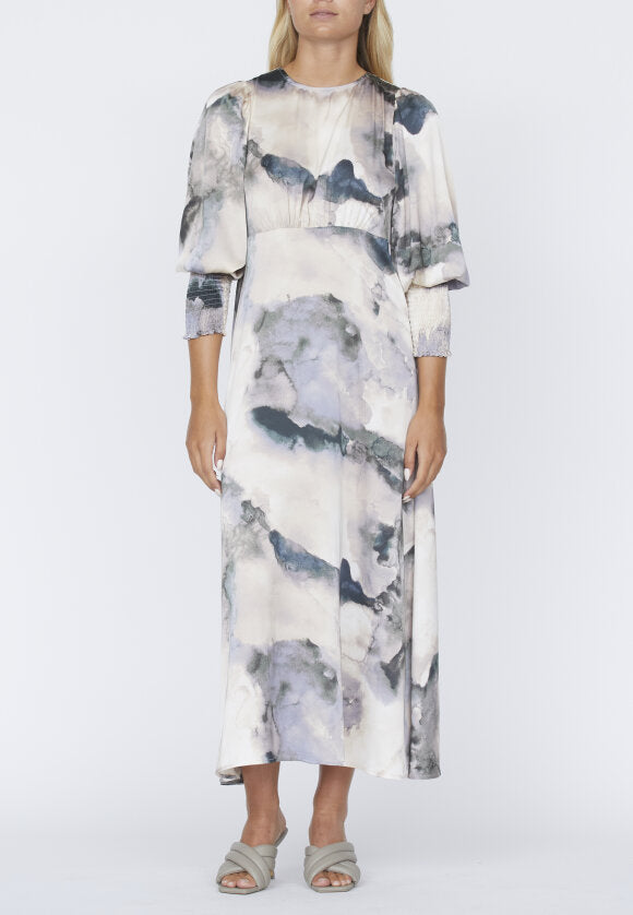 Lang kjole med en feminin pasform fra Love & Divine. Kjolen har et smukt akvarelprint, en rund hals og lange ærmer med smock.