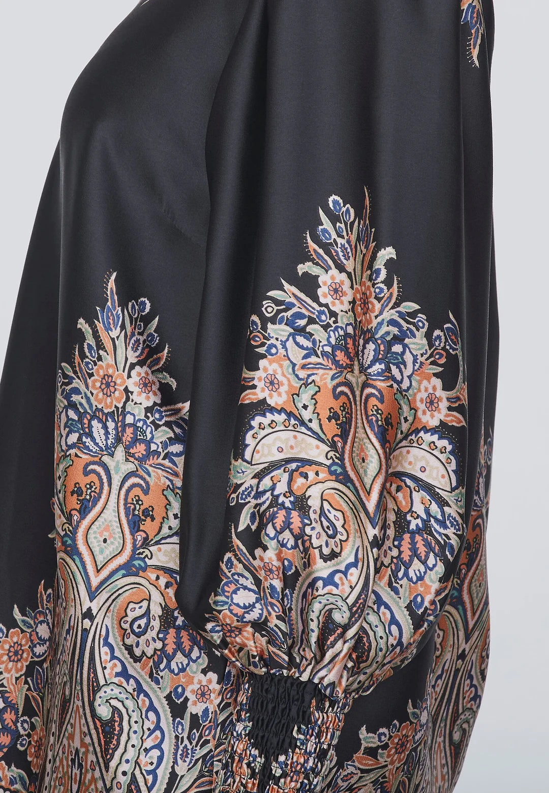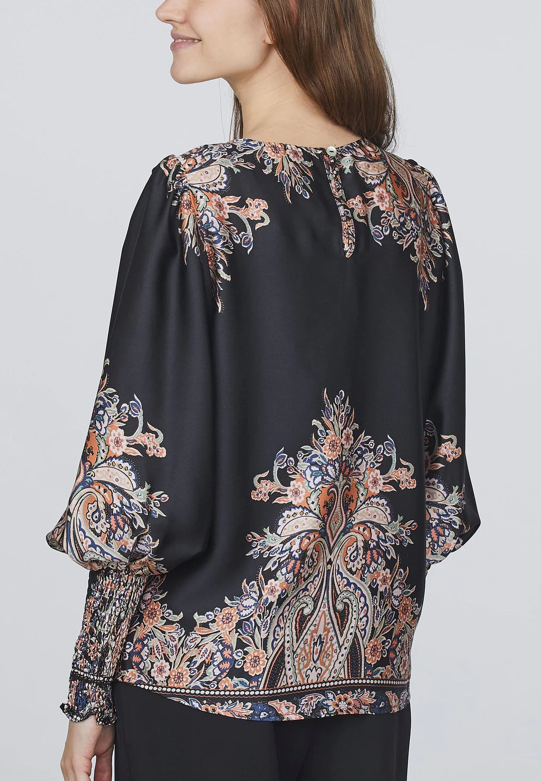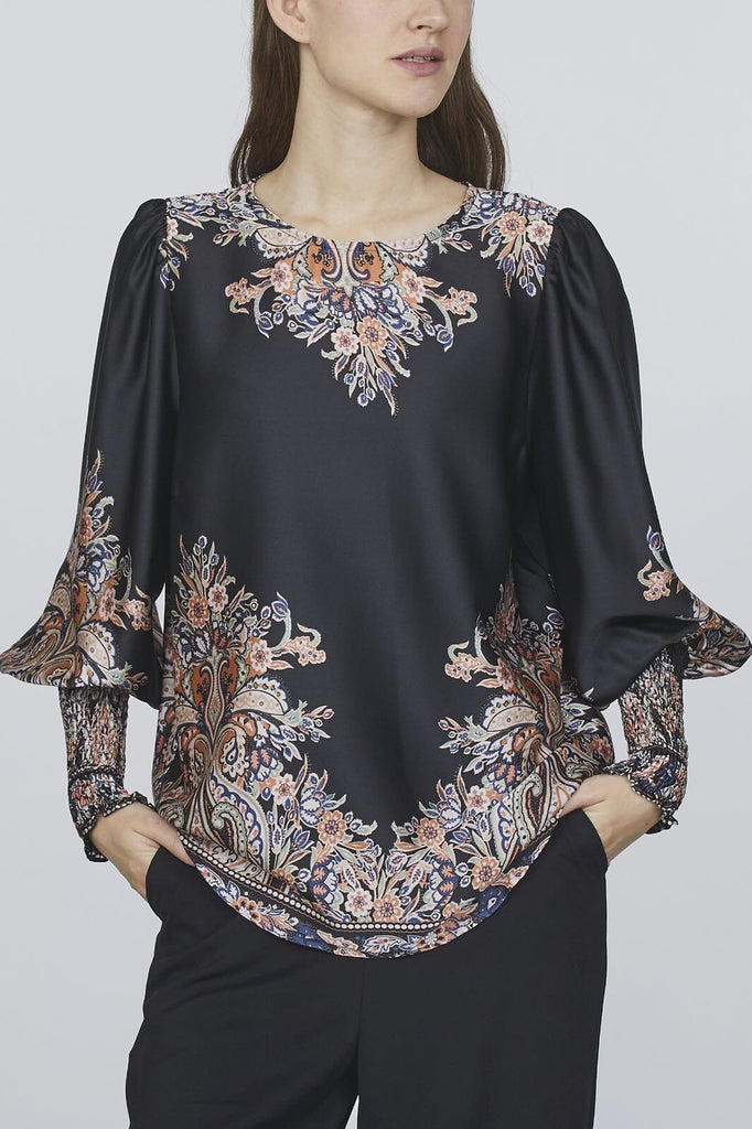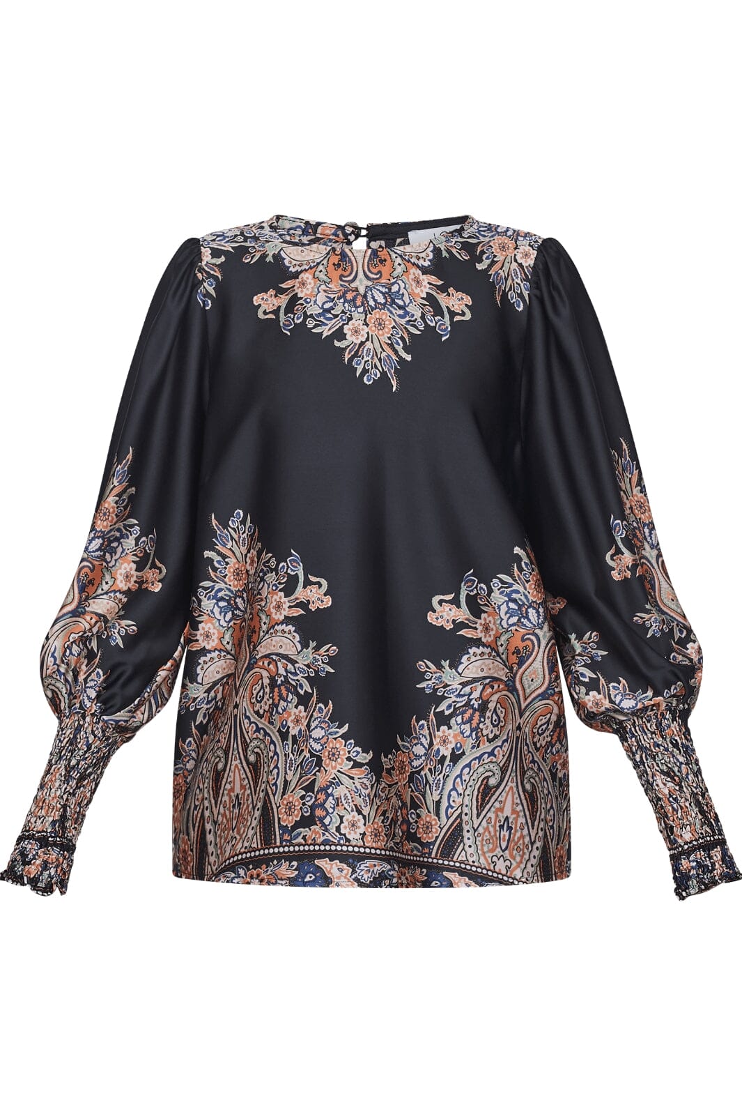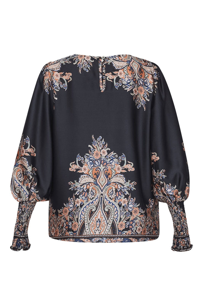 Enkel og elegant skjortebluse fra Love & Divine i det smukkeste paisley print. Skjorten har rund hals med brede ærmer og smockdetaljer. Den har en fin knappelukning i nakken, og har en løstsiddende pasform.