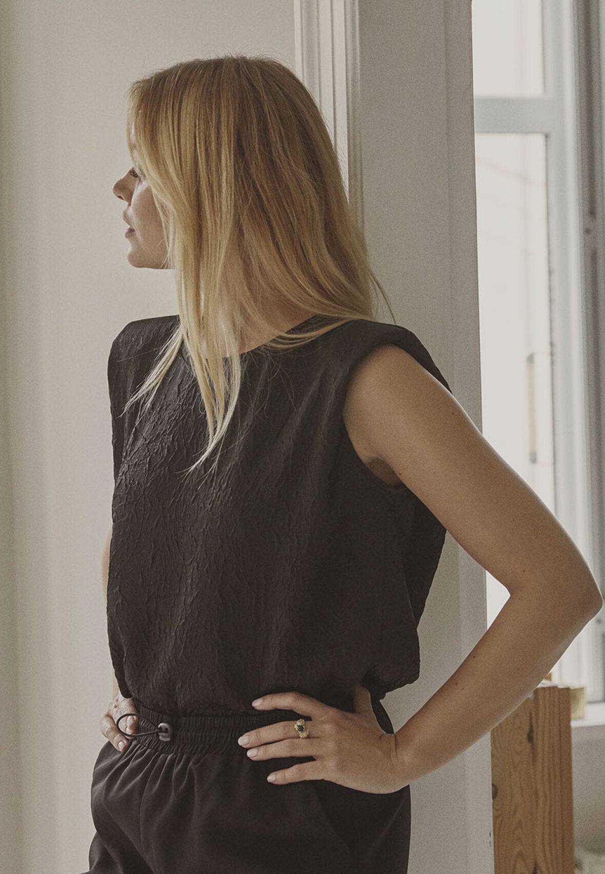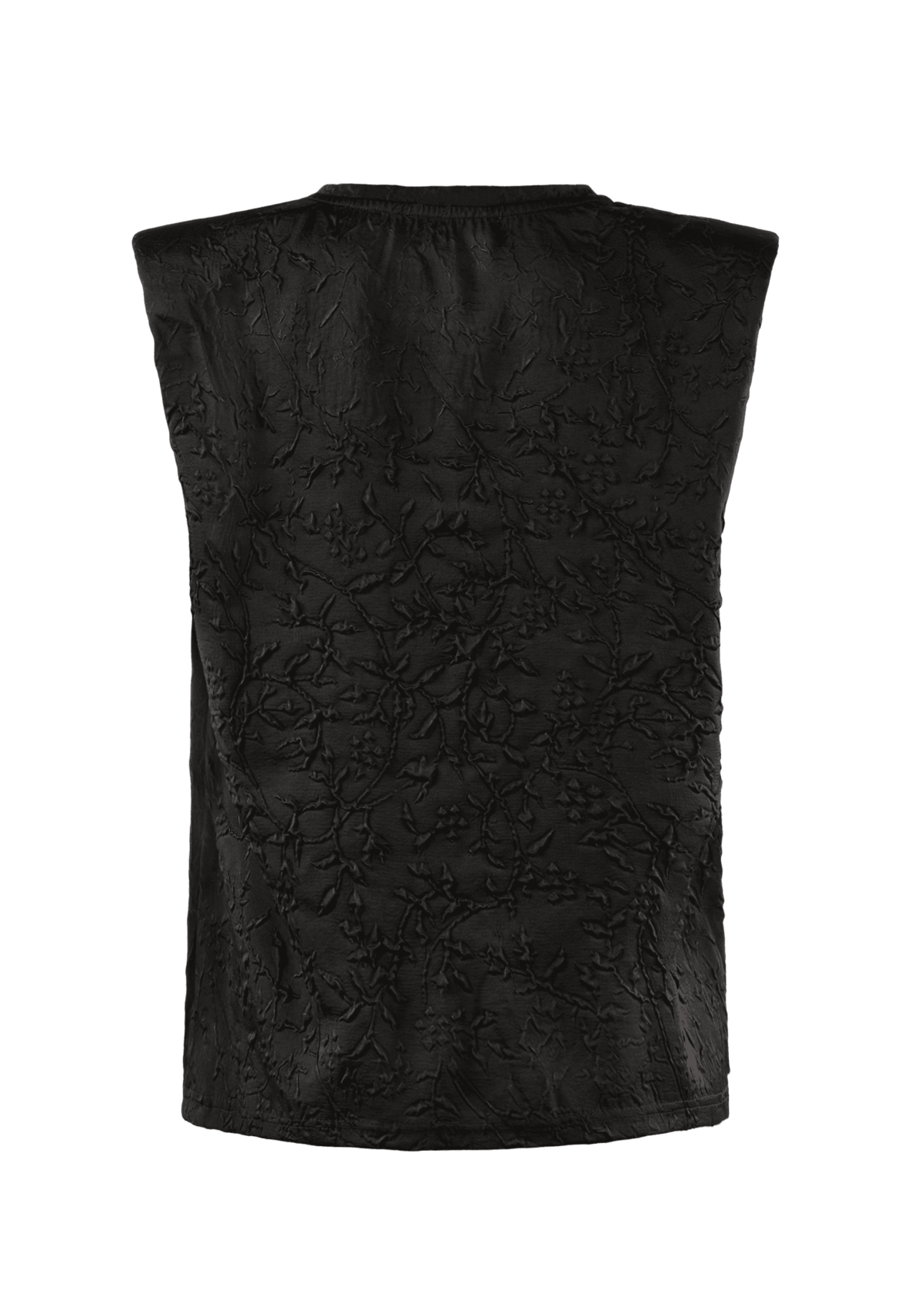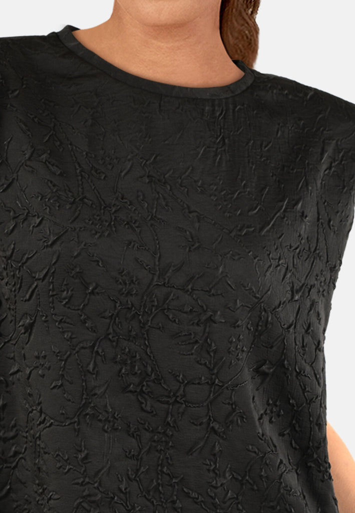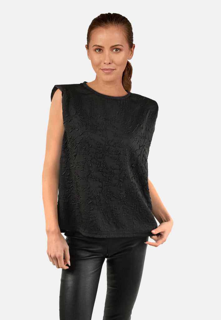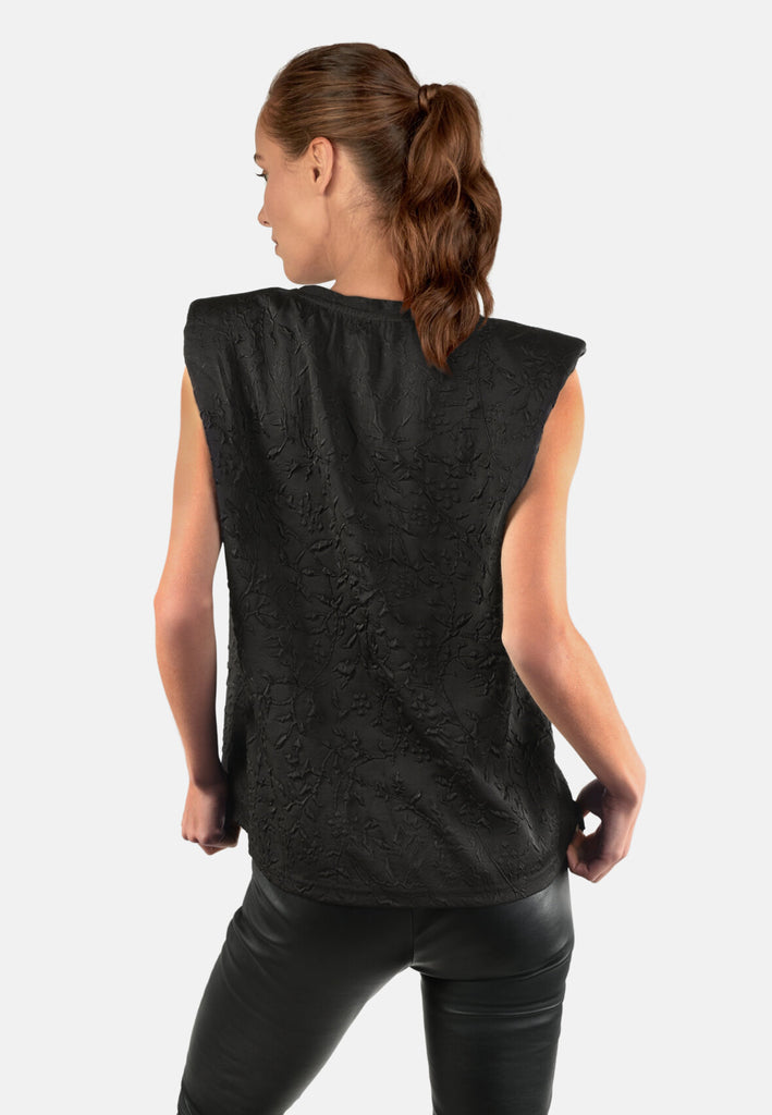 Mega cool sort top med tekstur i stoffet og feminine skulderpuder. Toppen har høj hals og en normal pasform.