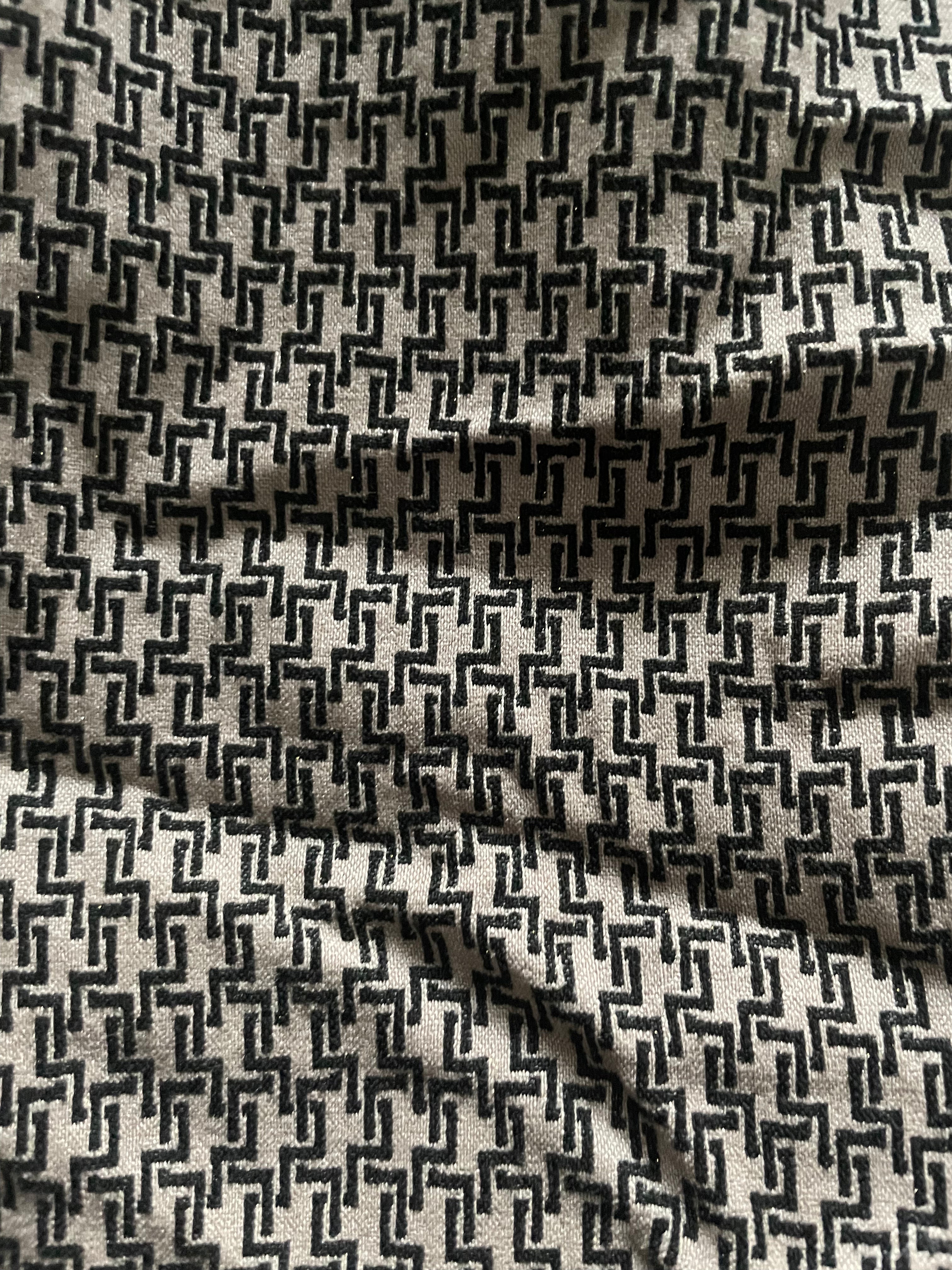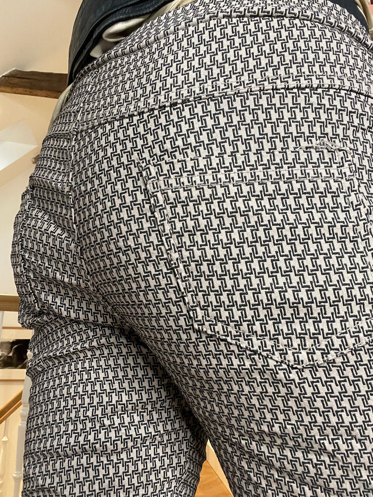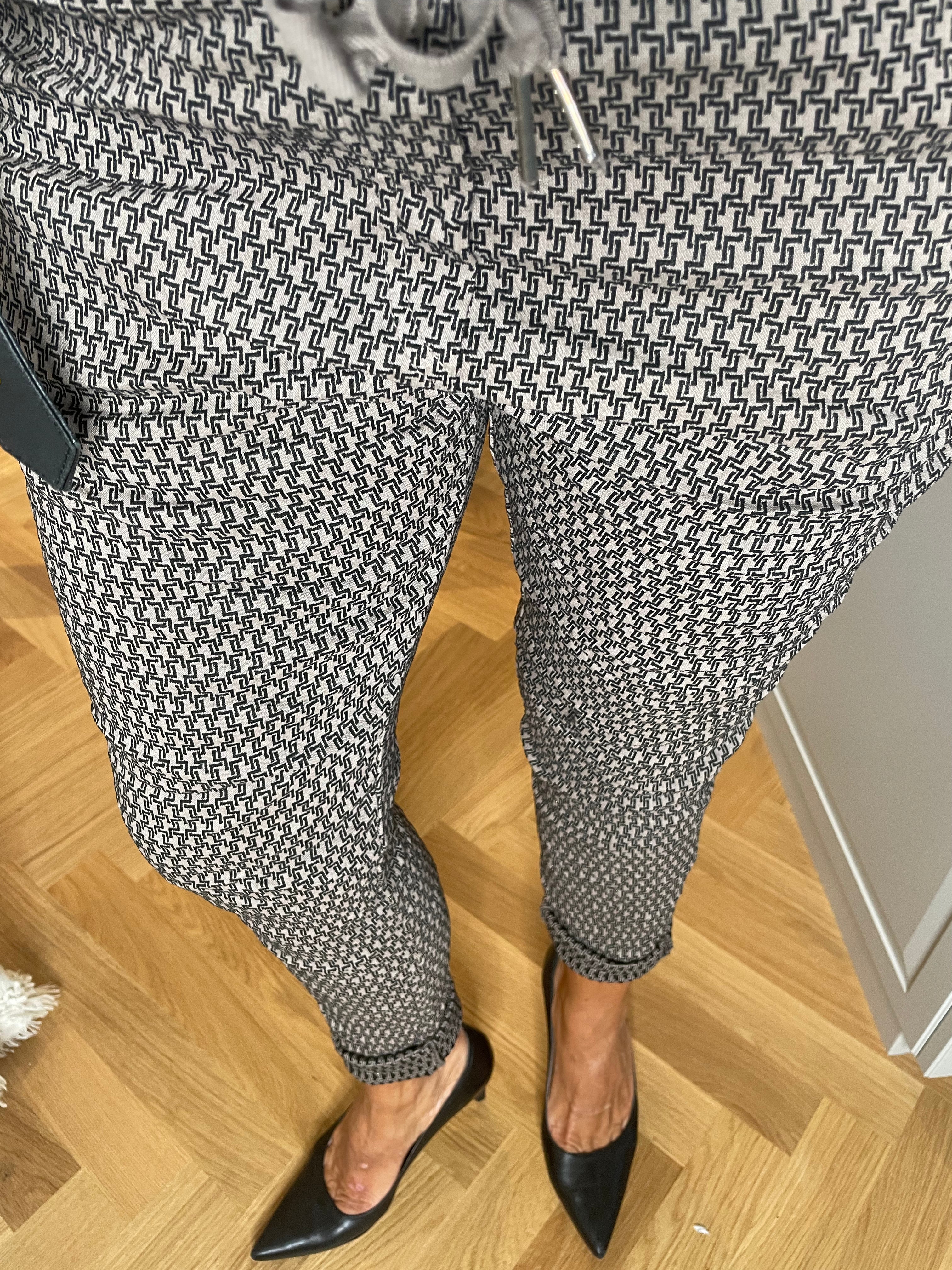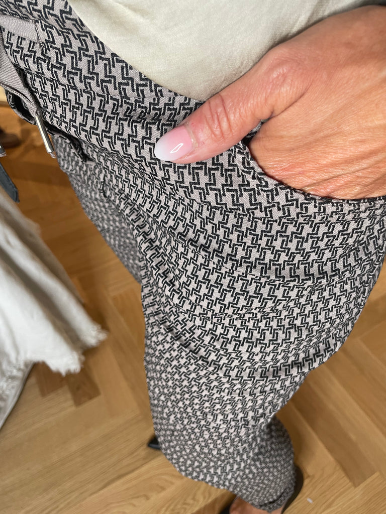 Super sej buks med snøre i taljen og skrålommer. Virkelig smuk mønster i taupe og sort.
