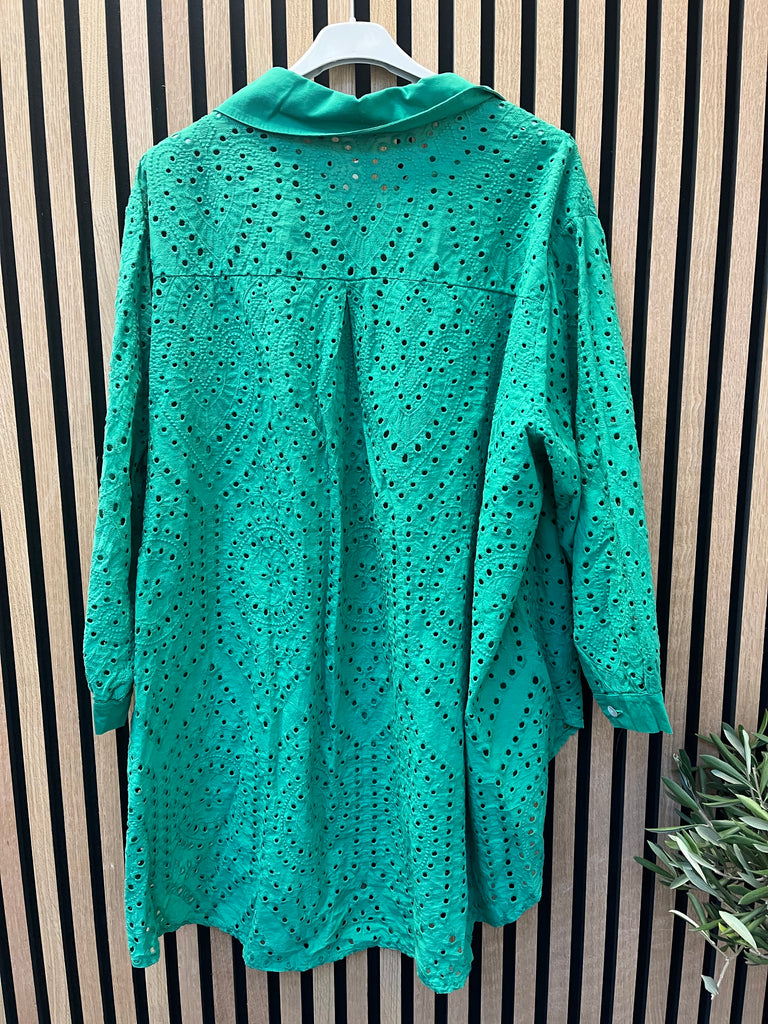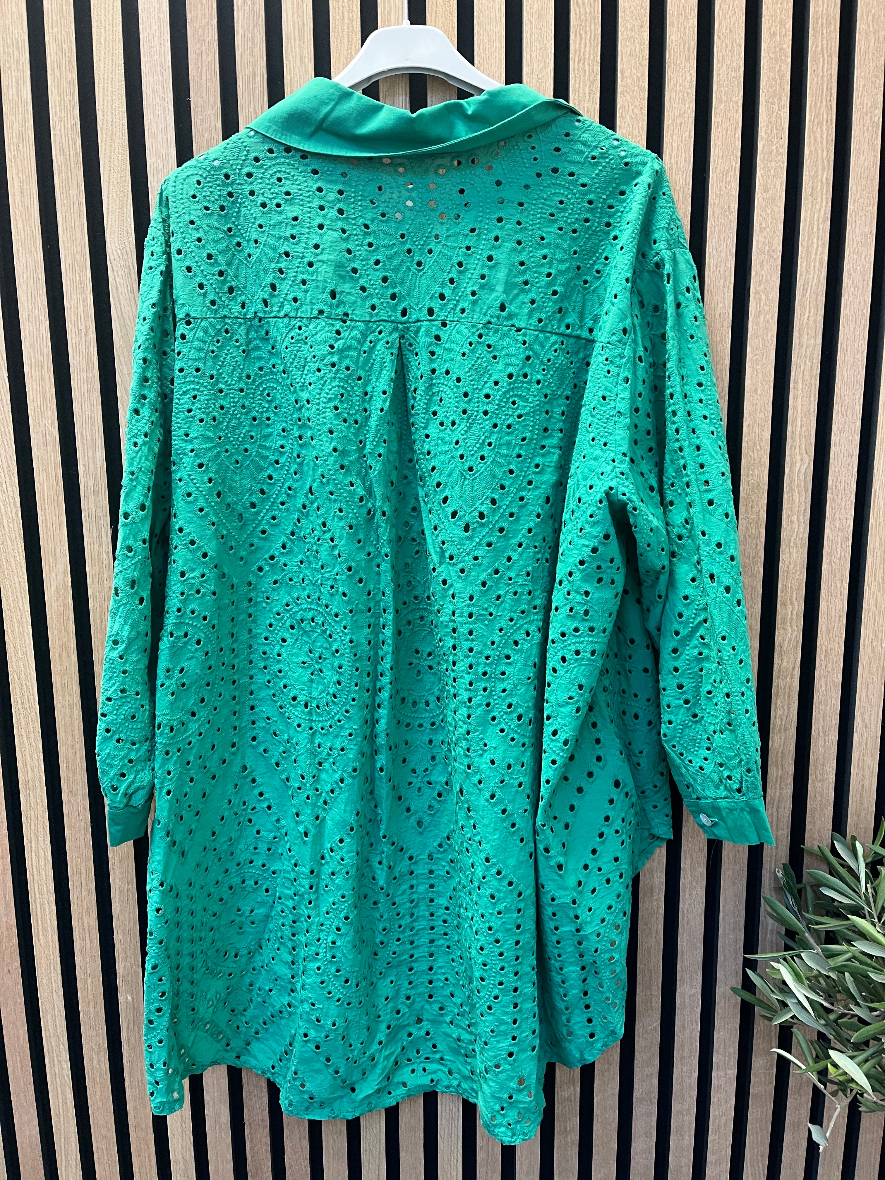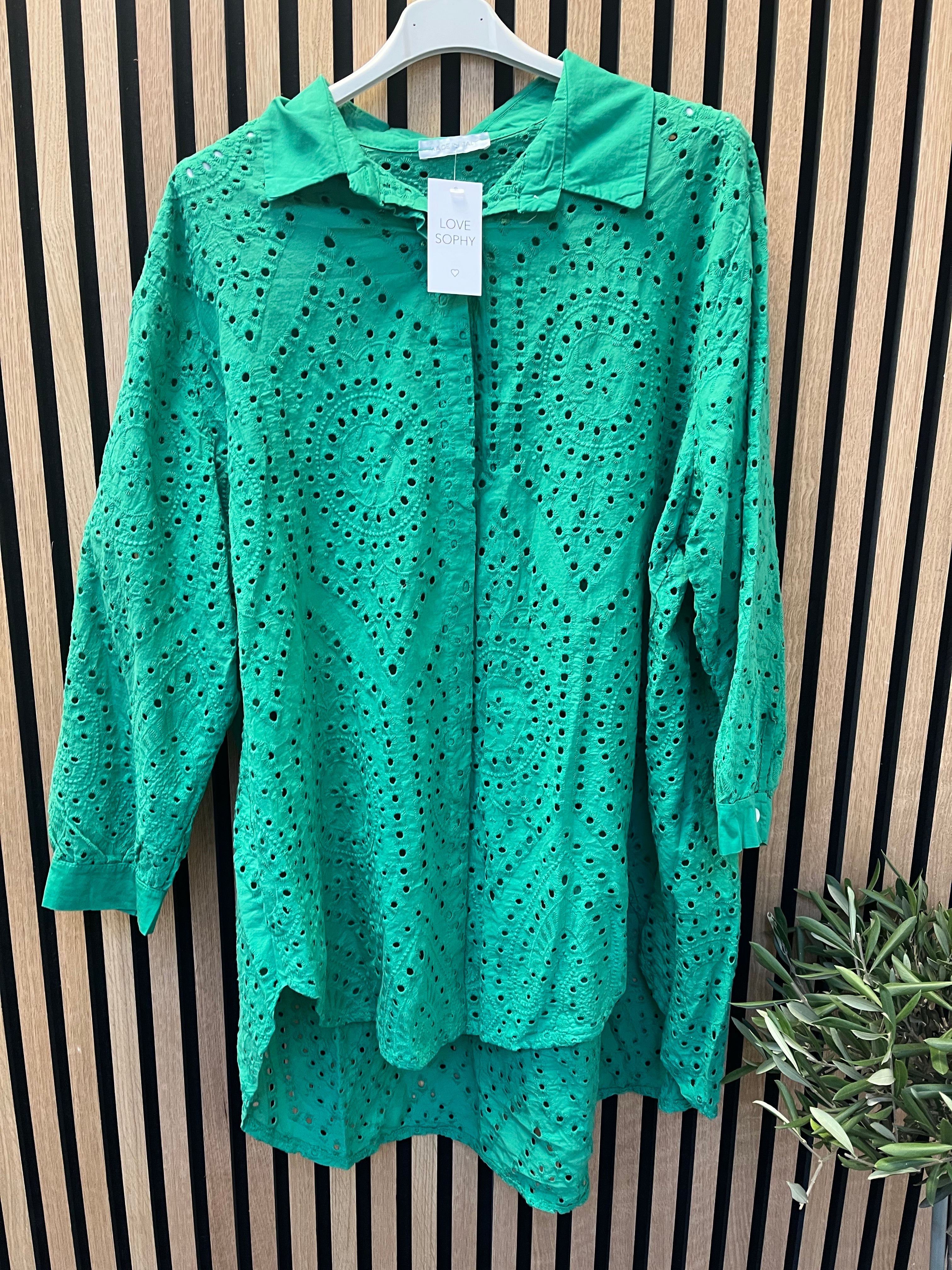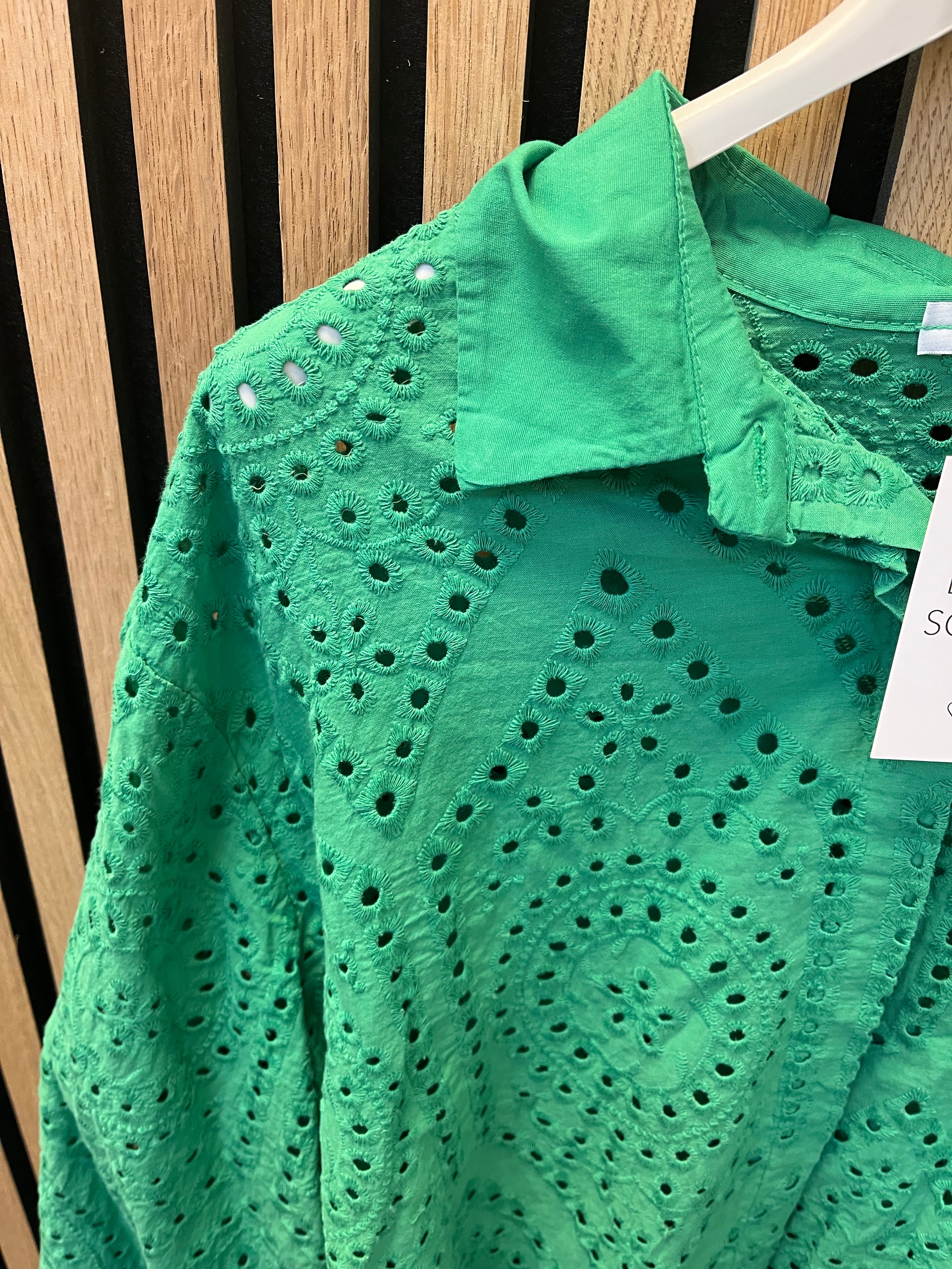 Flot broderi anglaise skjorte i grøn fra Love Sophy. Skjorten har krave og er gennemknappet fortil samt knappes forenden af ærmerne.