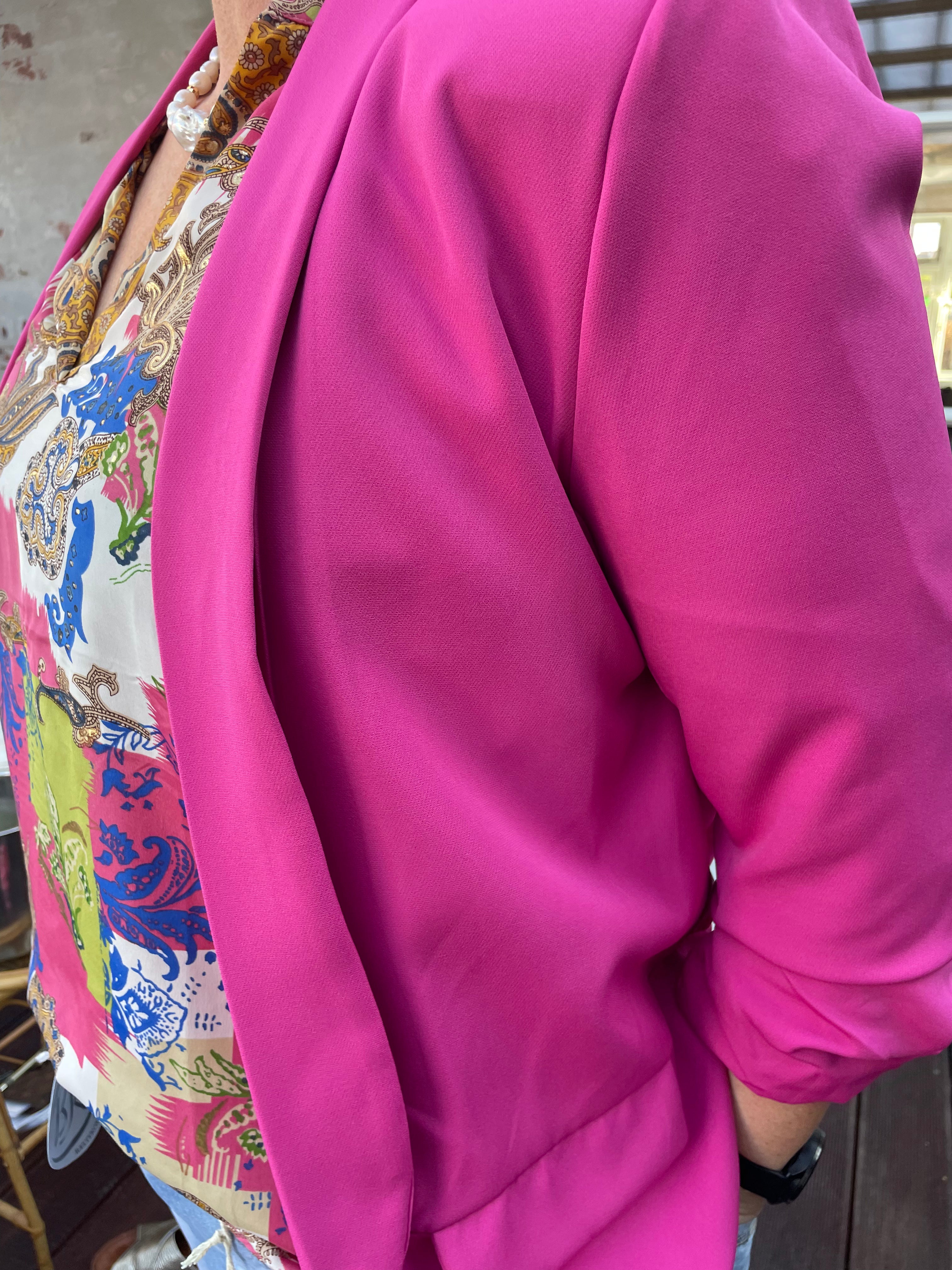 Skøn blazer/cardigan med 3/4 ærmer med "rynke-detalje" og revers. Der er snydelomer foran og længden er lige under bagdelen. Jakken har IKKE knapper, og er beregnet til at stå åben. Onesize passer s-xl.