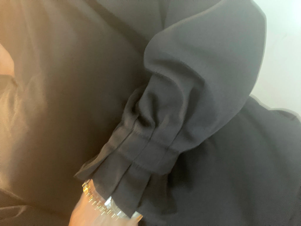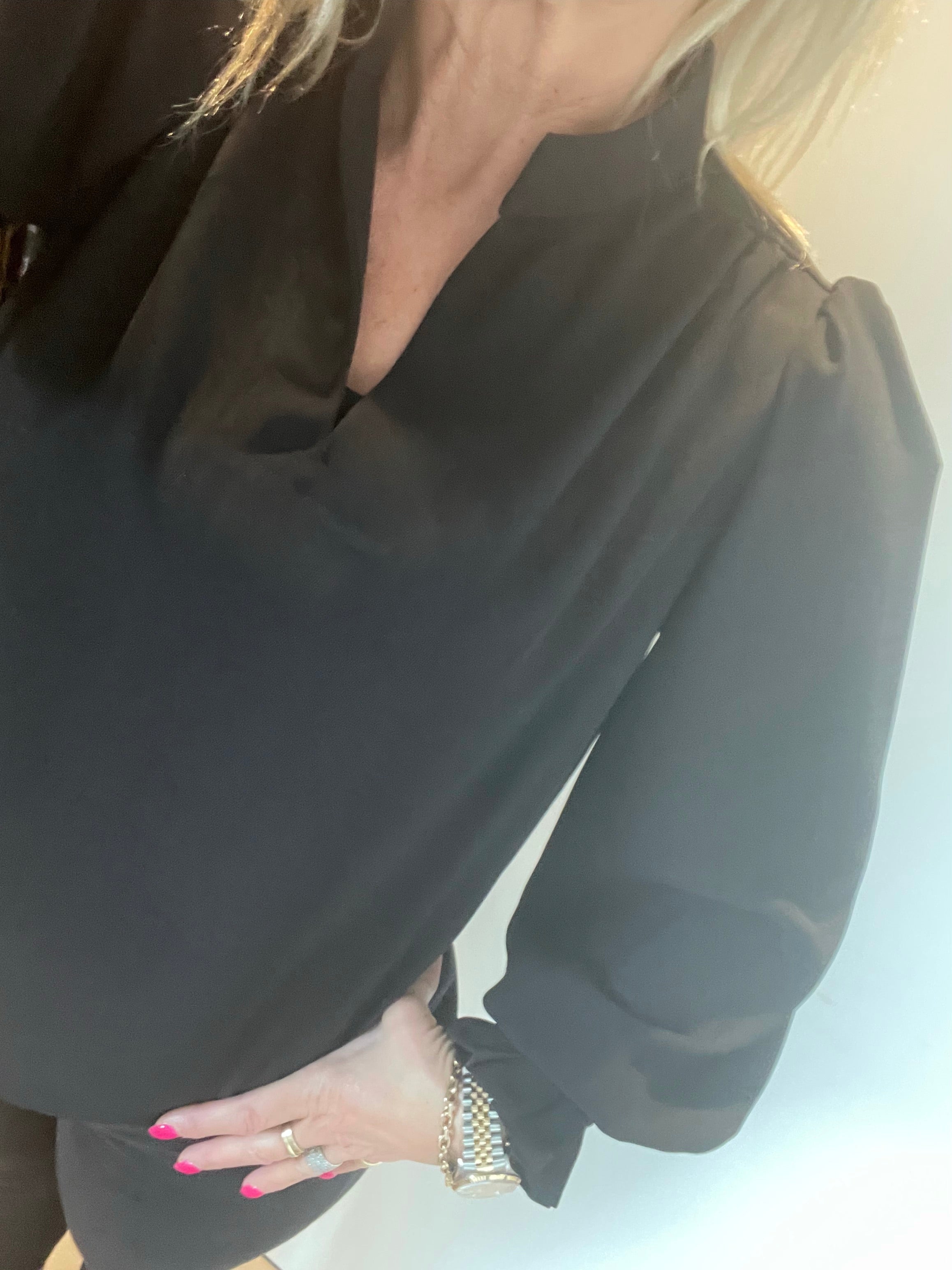 Smuk bluse fra Luxzuz i en sort farve. Blusen har v-udskæring og et flot fald. Ærmerne er lange med elastik ved håndleddene.