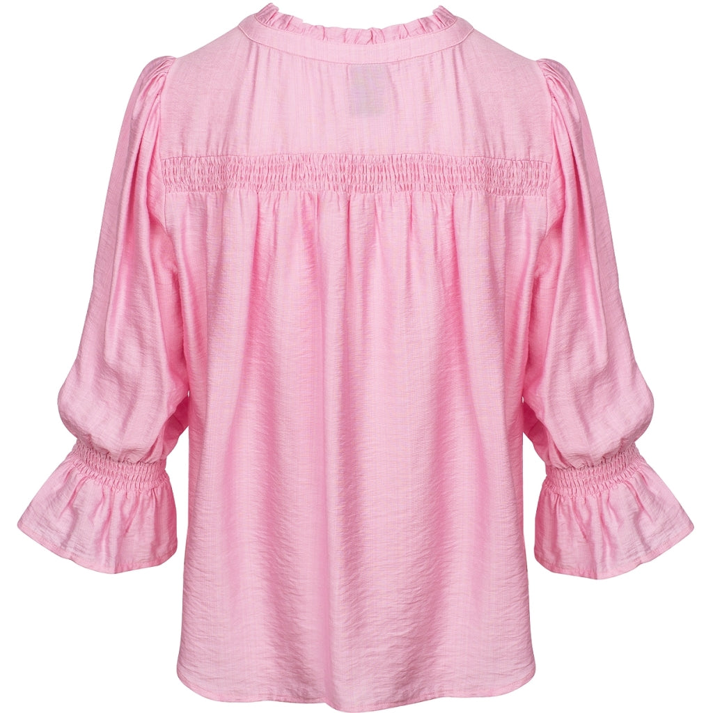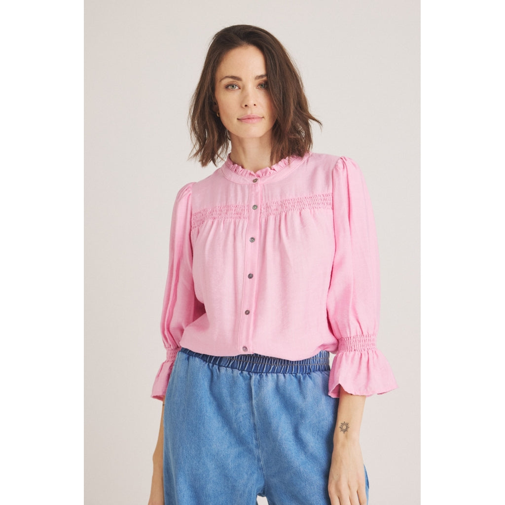 Feminin skjorte fra Luxzuz i en skøn viskosekvalitet. Skjorten har en løs pasform, fine smock-detaljer på brystet og ved ærmerne, som tilføjer et feminint touch. Den har en rund hals med en let flæsekant.