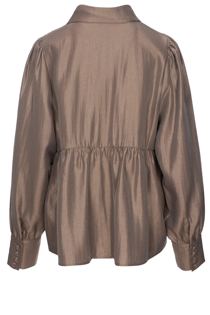 Elegant skjorte fra LUXZUZ, utrolig flot med store puffede ærmer, der afsluttes med en manchet og 4 stof betrukket knapper. Skjorten har en klassisk krave, stofbetrukket knapper hele vejen ned, en overskæring fra siderne og over ryggen.