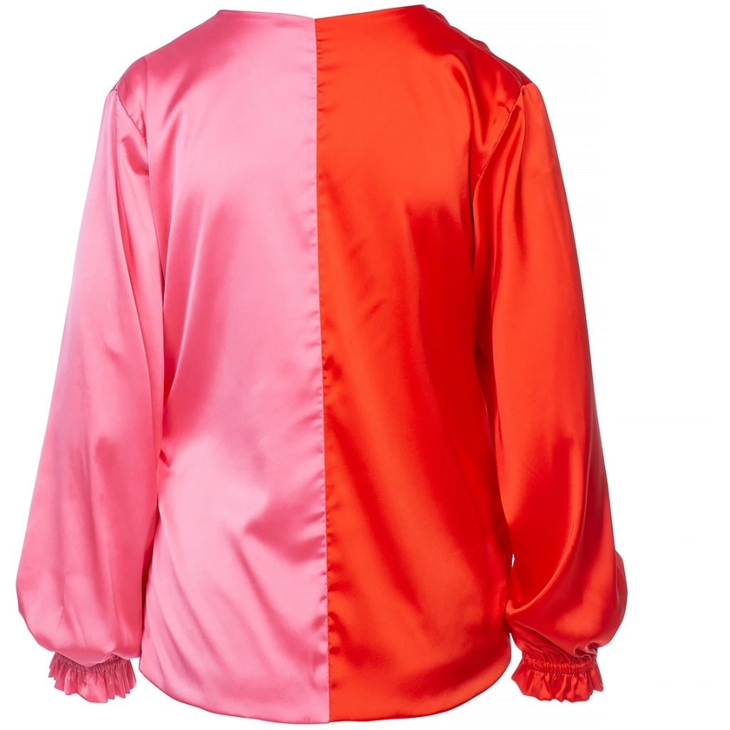 Den smukkeste wrapbluse fra Luxzuz i den skønne todelte farvekombination med rød og pink.