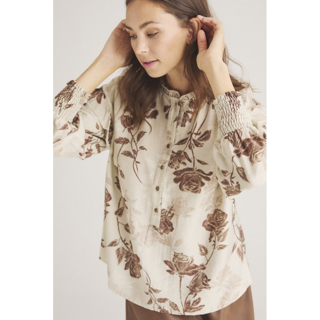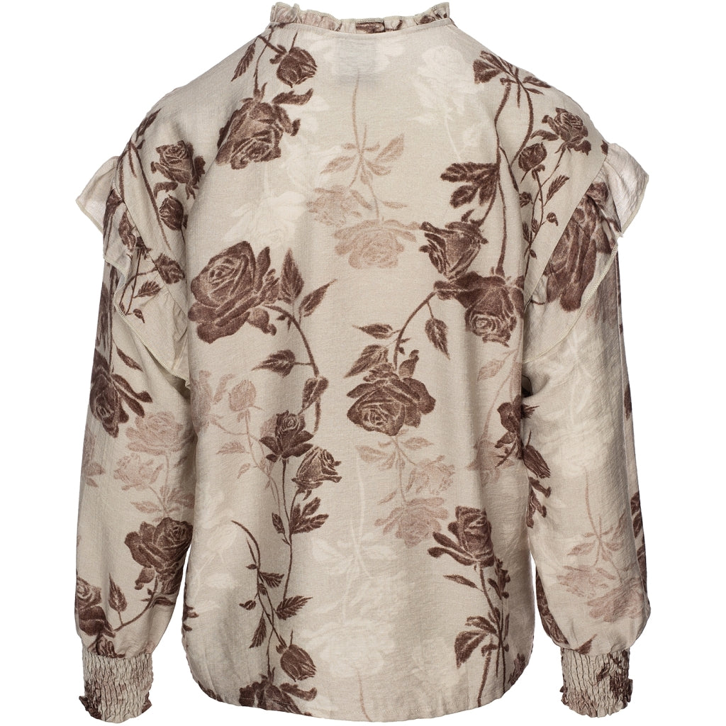 Flot skjorte fra Luxzuz med flæse rundt i halsen. Blusen har stolpelukning og lange ærmer der afsluttes med en bred smock. Skjorten er i en skøn viskosekvalitet og har en fin flæse detalje ved skuldererne.