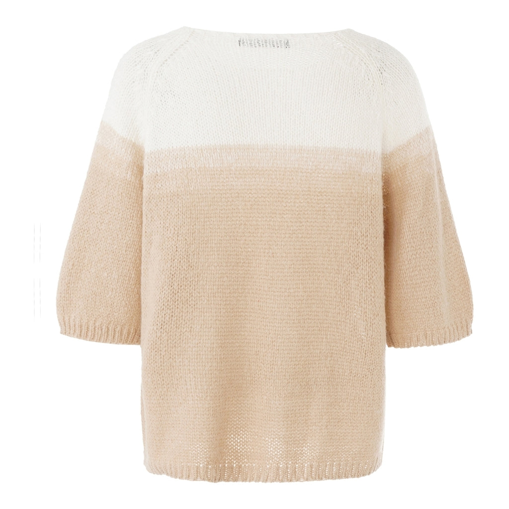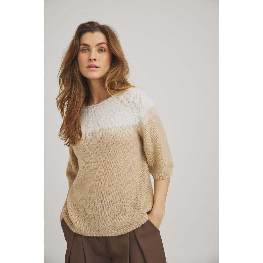 Blød og let strikbluse i en fin strikkvalitet med et moderne farvespil. Modellen er designet med rund hals og korte ærmer samt en enkel og ren konstruktion, der giver et afslappet og moderne udtryk. Strikken er udført i to farvefelter, hvor den øverste del er strikket i et meleret farvespil. Pasformen er let og behagelig, hvilket gør strikken nem at style både til hverdag og mere afslappede anledninger.