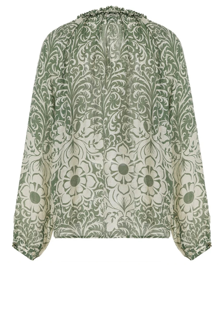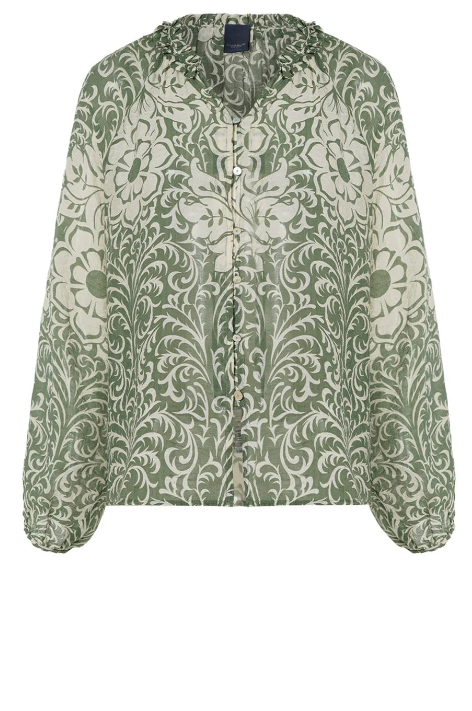 Skjorteblusen har en flot flæsekant ved halsudskæringen, knaplukning foran og lange, løstsiddende ærmer der afsluttes med en lille knap.
