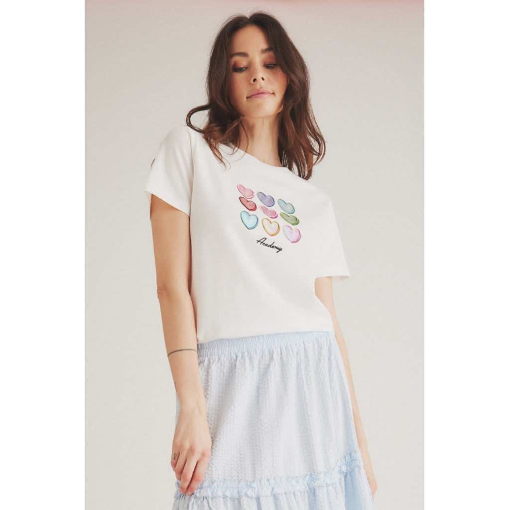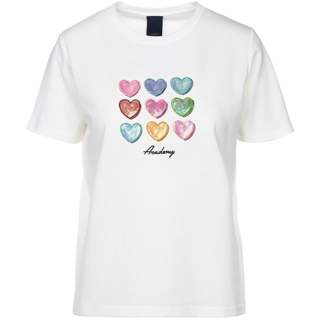 Sød T-shirt fra Luxzuz med hjerte broderi og pailletter på brystet. T-shirten har klassisk rund hals og et kort ærme.