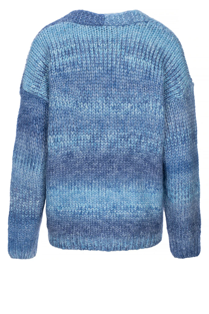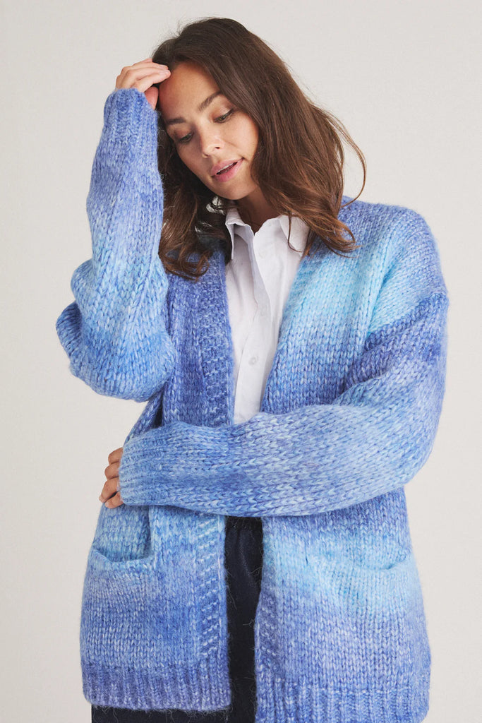Super cool strik cardigan fra Luxzuz i flotte blå nuancer. Strikken er moderart løs, har lange ærmer, bundkanten samt ærmer afsluttes pænt med en ribkant.