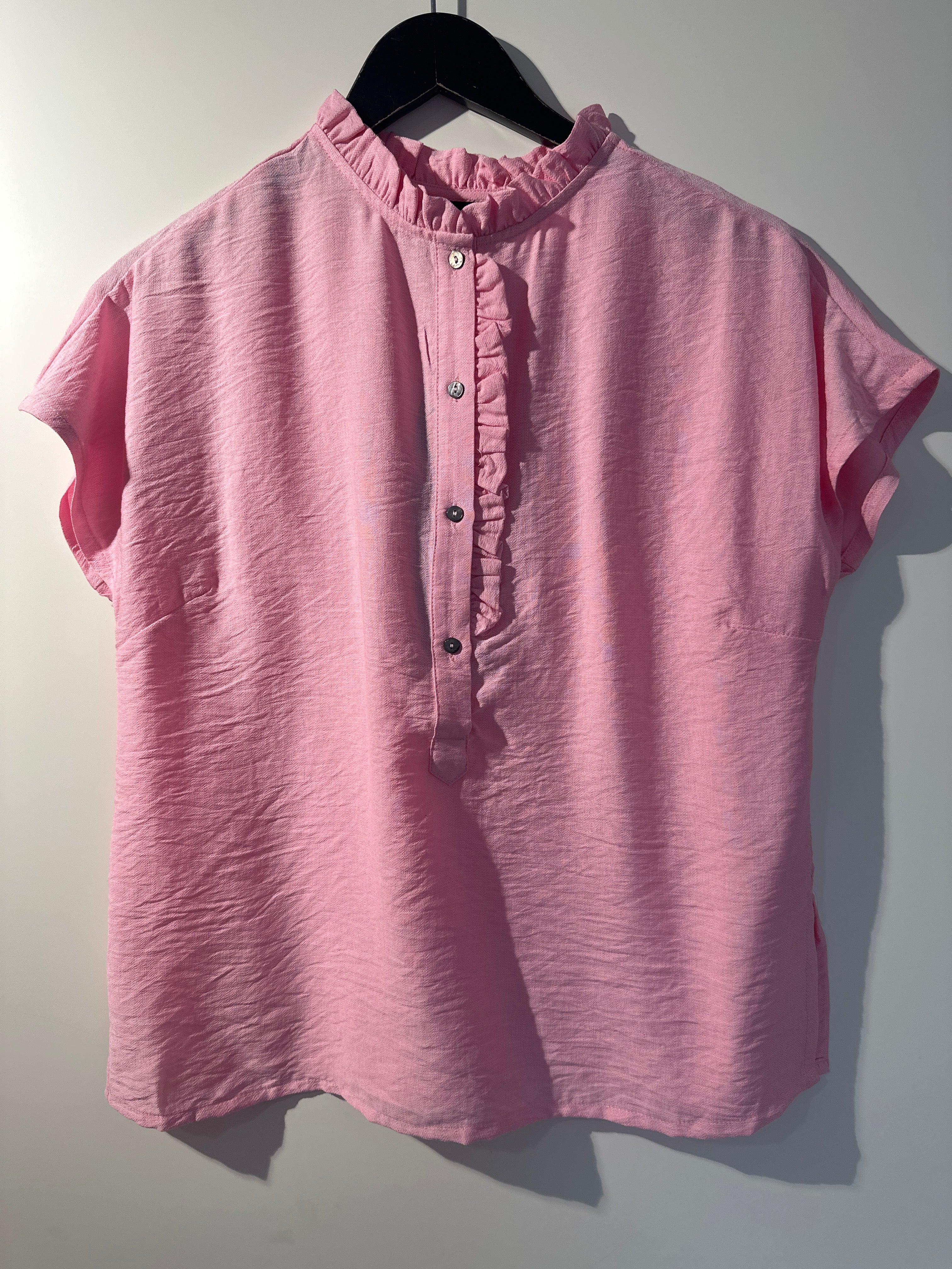 Let og feminin bluse fra Luxzuz med et kort ærme og rund hals. Blusen har knaplukning og fine flæsedetaljer ved halsudskæringen og stolpen, som tilfører et blødt og elegant udtryk.
