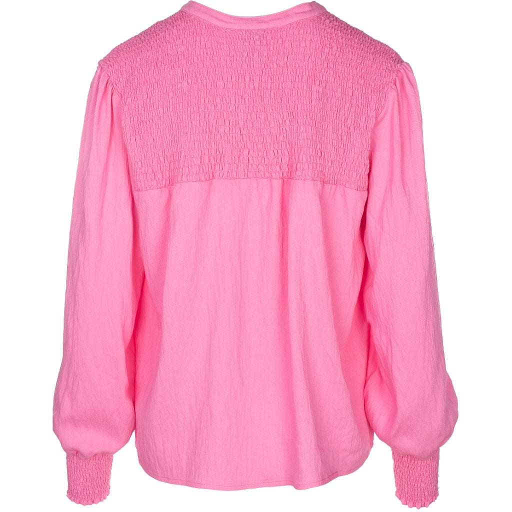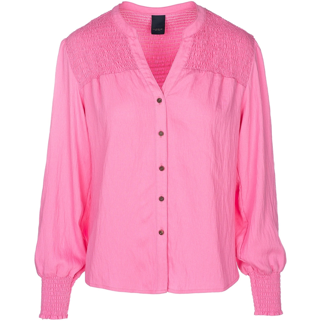 Cool skjorte fra Luxzuz med rund hals, der åbner op i et V. Skjorten er gennemknappet og har en bred smock henover skulder og øverst på ryggen. Der er lange ærmer, som afsluttes med en bred smock.