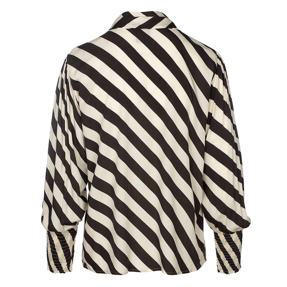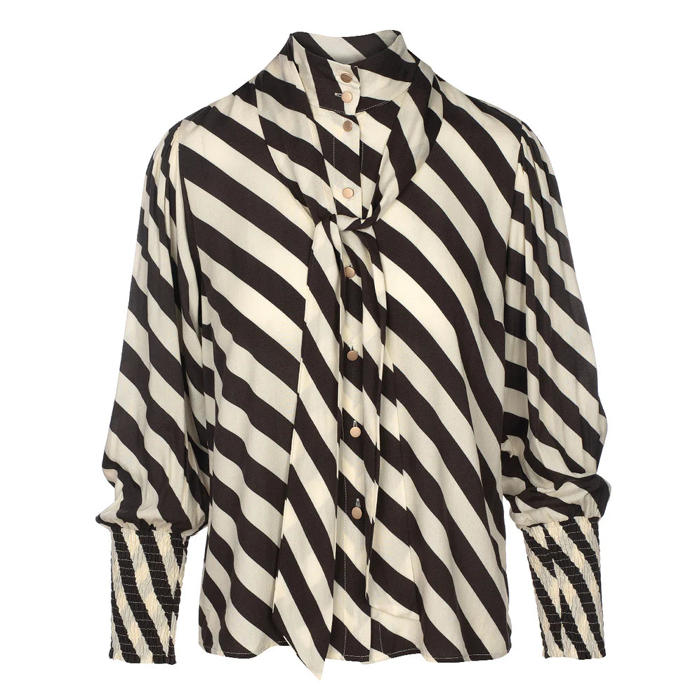 Smuk stribet skjorte fra Luxzuz med høj høj hals og aftageligt bindebånd.. Skjorten er gennemknappet, har lange løse ærmer der afsluttes med en bred manchet og tre knapper.