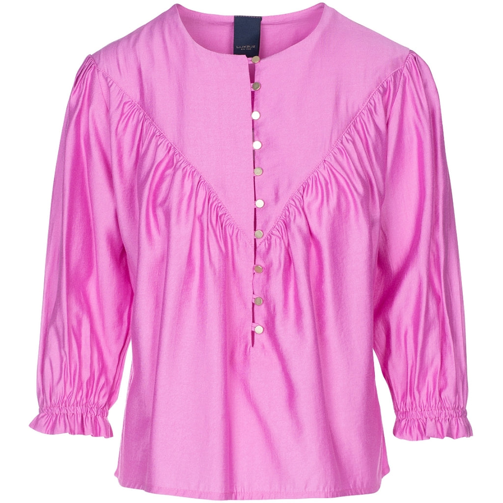 Rigtig fin bluse fra LUXZUZ ONE TWO, blusen har rund hals med gyldne metal knapper ned foran. De små rynk hele vejen rundt på blusen giver lidt vidde. 3/4 lange ærmer, der afsluttes med en elastisk flæse.