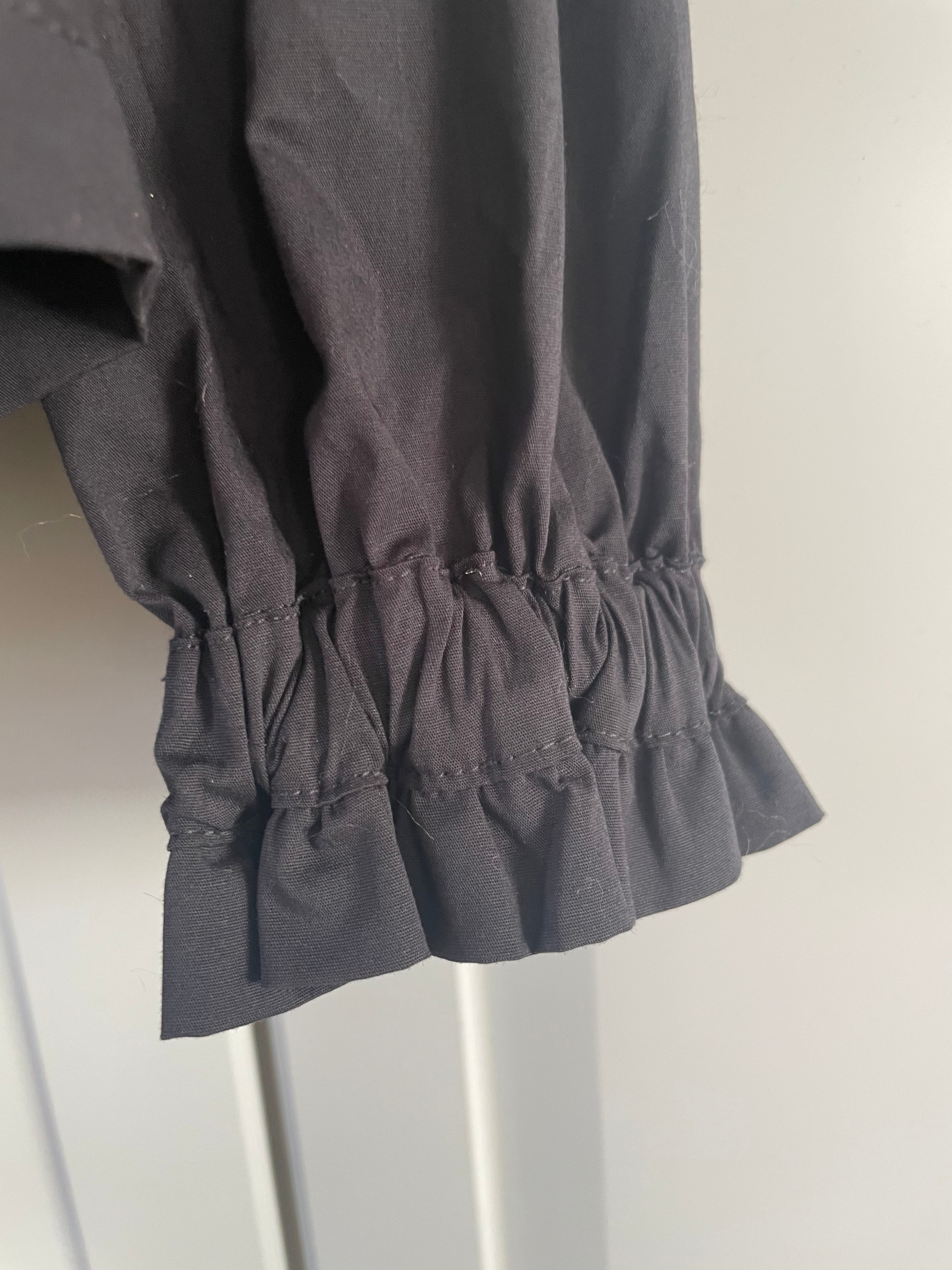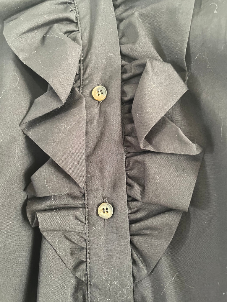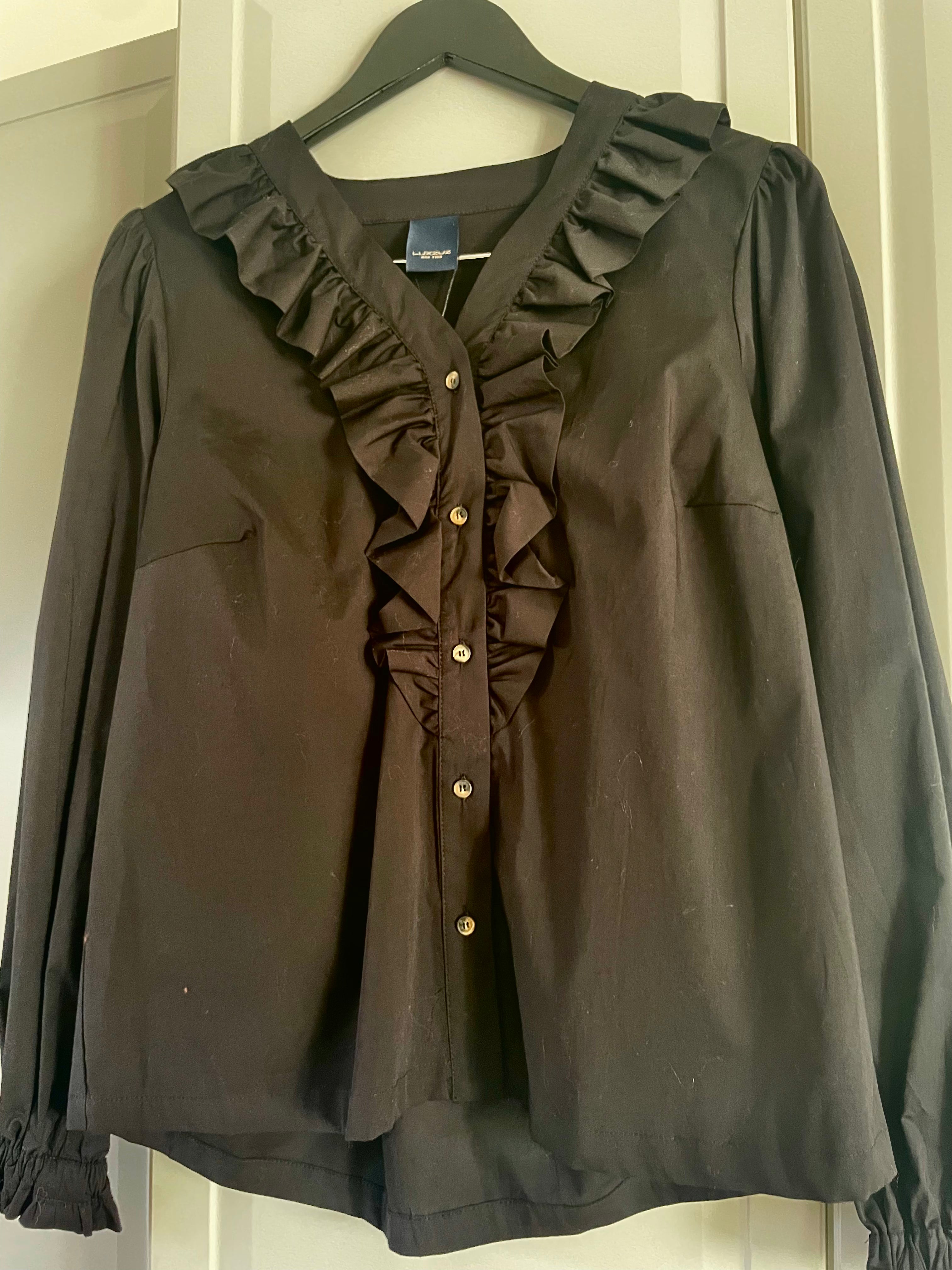 Flot skjorte fra LUXZUZ One Two med en bred flæse fra halsen og ned på brystet. Skjorten er sort og er gennemknappet. De lange ærmer afsluttes med en flæse og har lidt pufeffekt.