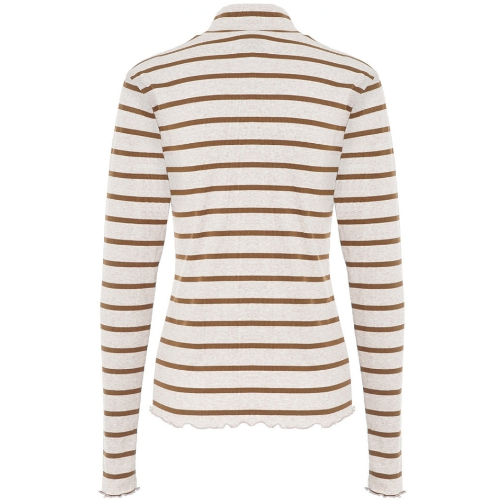 Stribet langærmet bluse fra LUXZUZ i et blødt og ribbet stof der giver en behagelig pasform, mens de bølgede kanter ved ærmer og bund tilføjer et feminint og moderne touch. Blusen har en højere halsudskæring, som giver et stilrent udtryk.