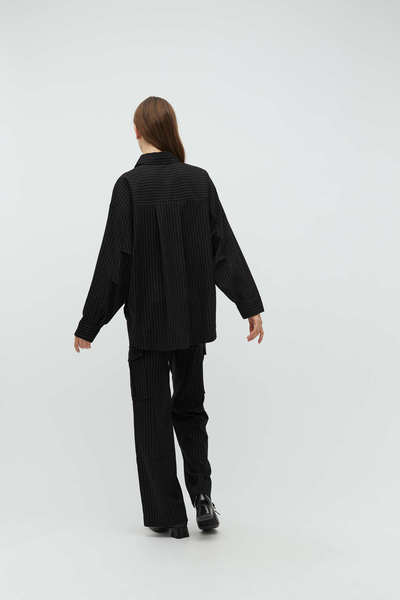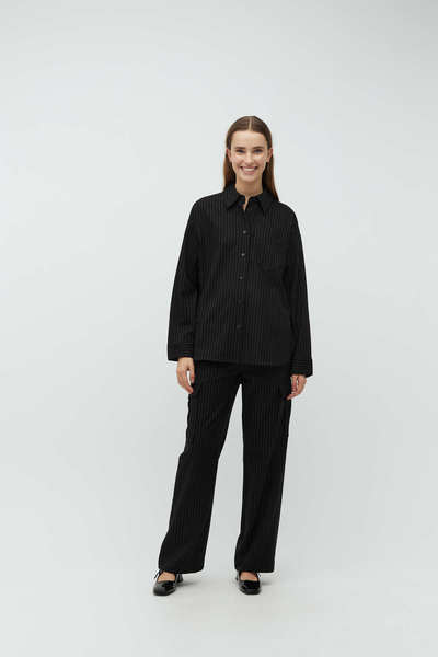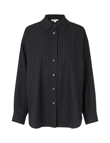 Fed oversize skjorte fra mbyM i sort med hvid pinstripe. Skjorten har en oversize pasform med lange ærmer og krave.