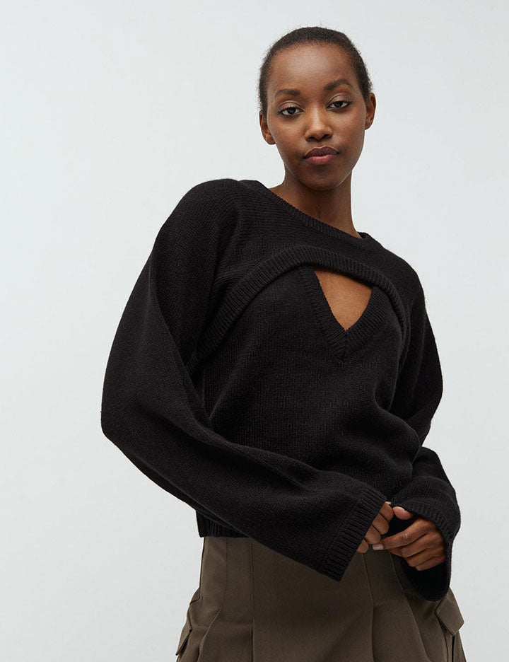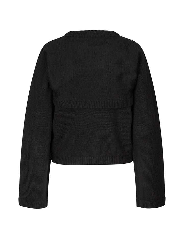 Mega cool strik fra MbyM. Strikken er , 2 delt sat sammen, når du modtager den, men er meningen, du skal klippe delene fra hinanden, som består af en strikvest med v-udskæring og en overdel med lange ærmer med vidde.