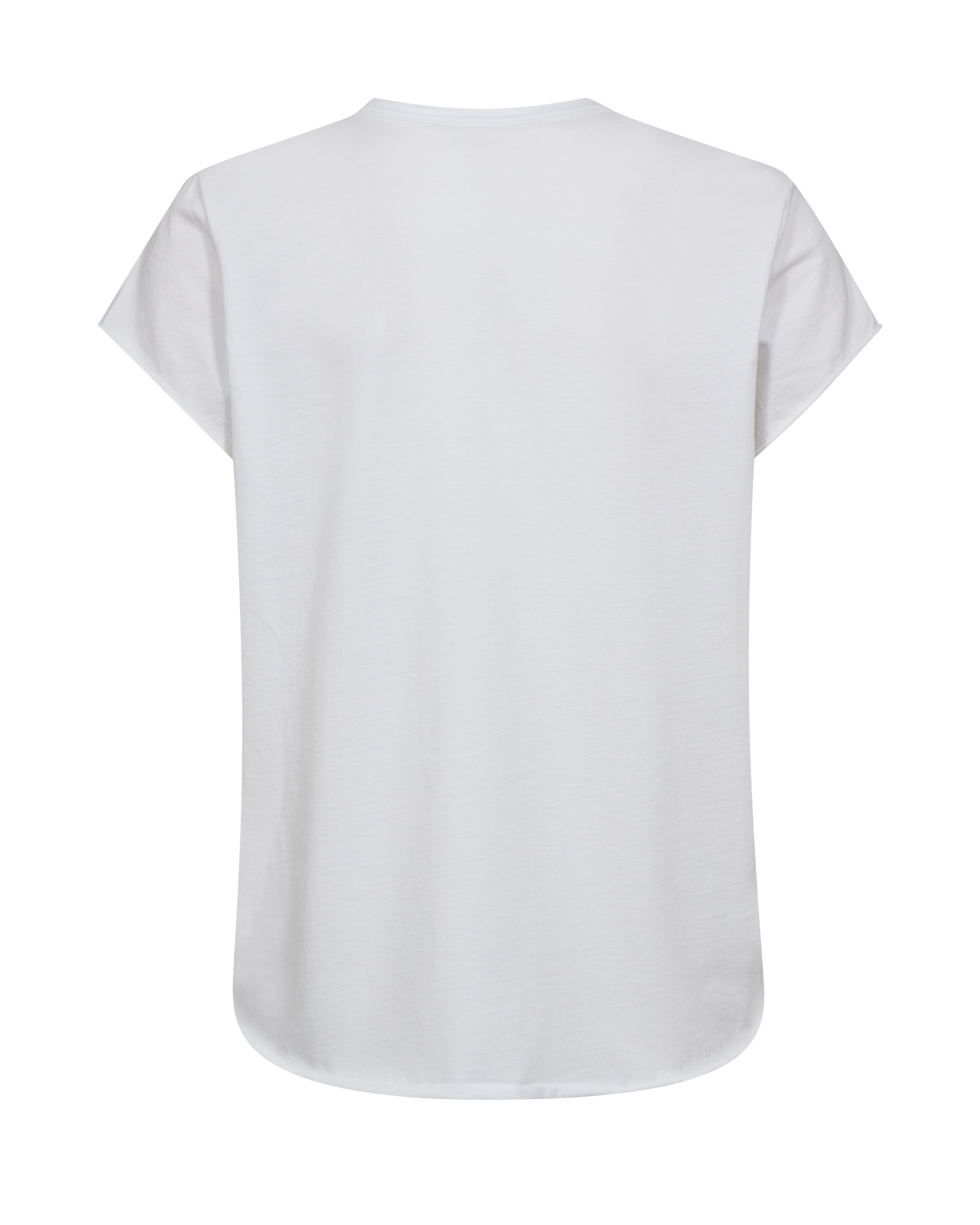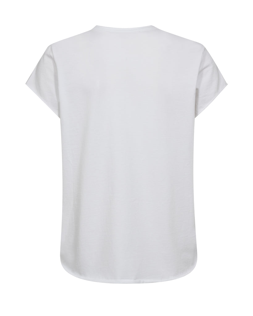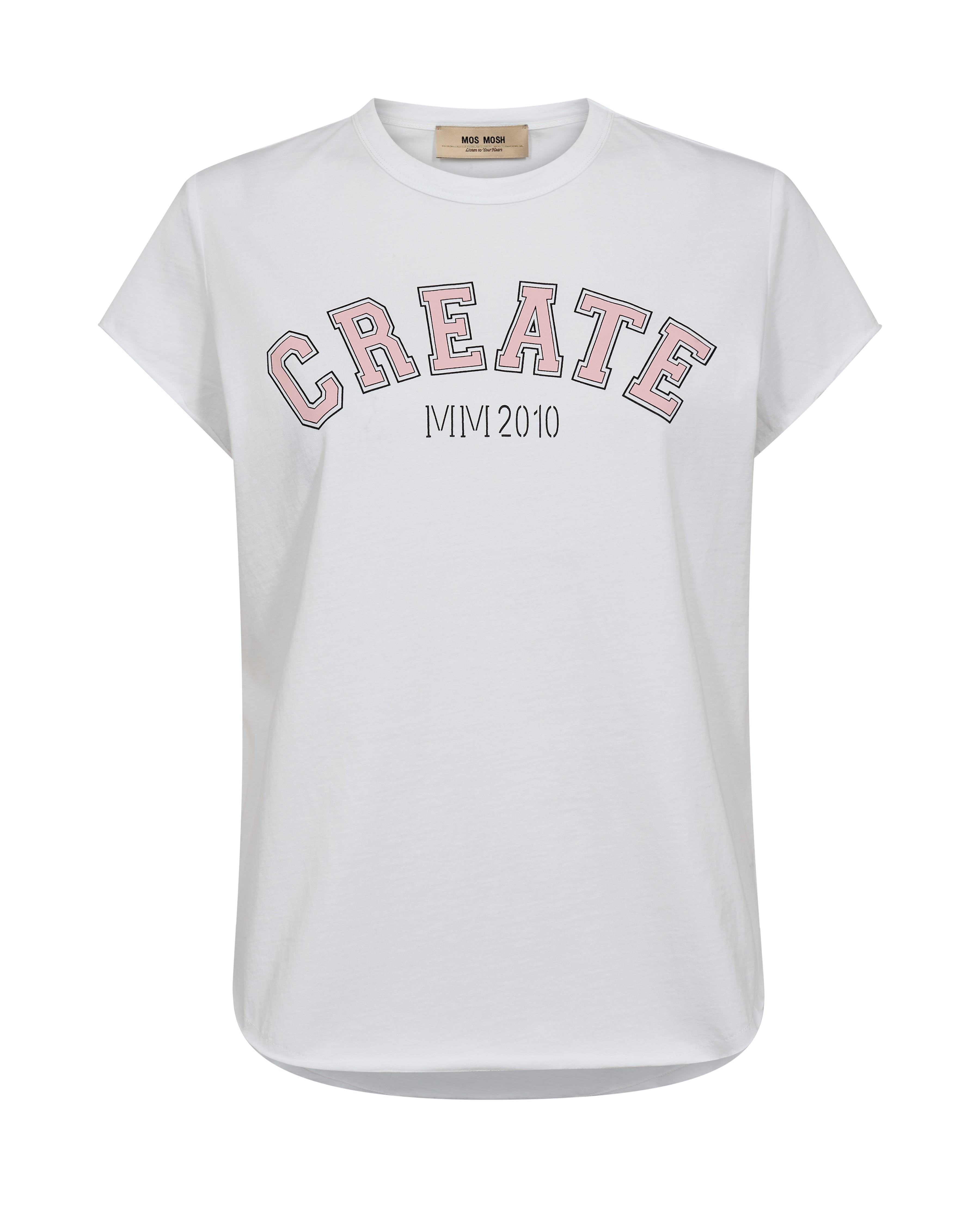 Cool t-shirt fra Mos Mosh i en løs pasform, sejt print og med et lille ærme. Kanten i bunden af t-shirten og ved ærmet har en rå afslutning.