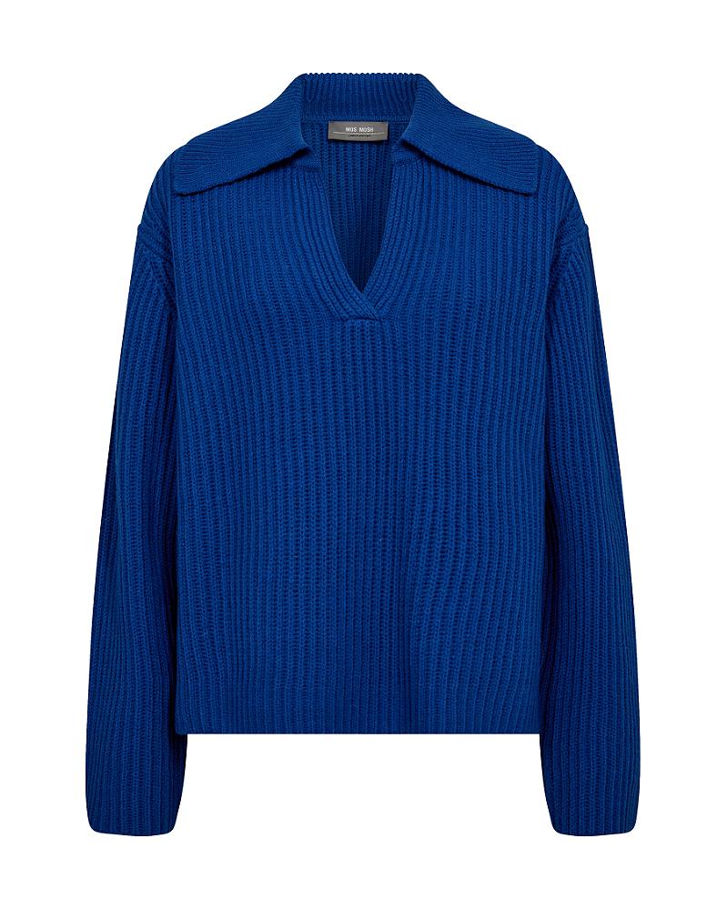 Skøn, enkel og eksklusiv strik fra Mos Mosh med v-udskæring. krave og let vidde i ærmerne. Stor i størrelsen - vi anbefaler at gå et nummer ned