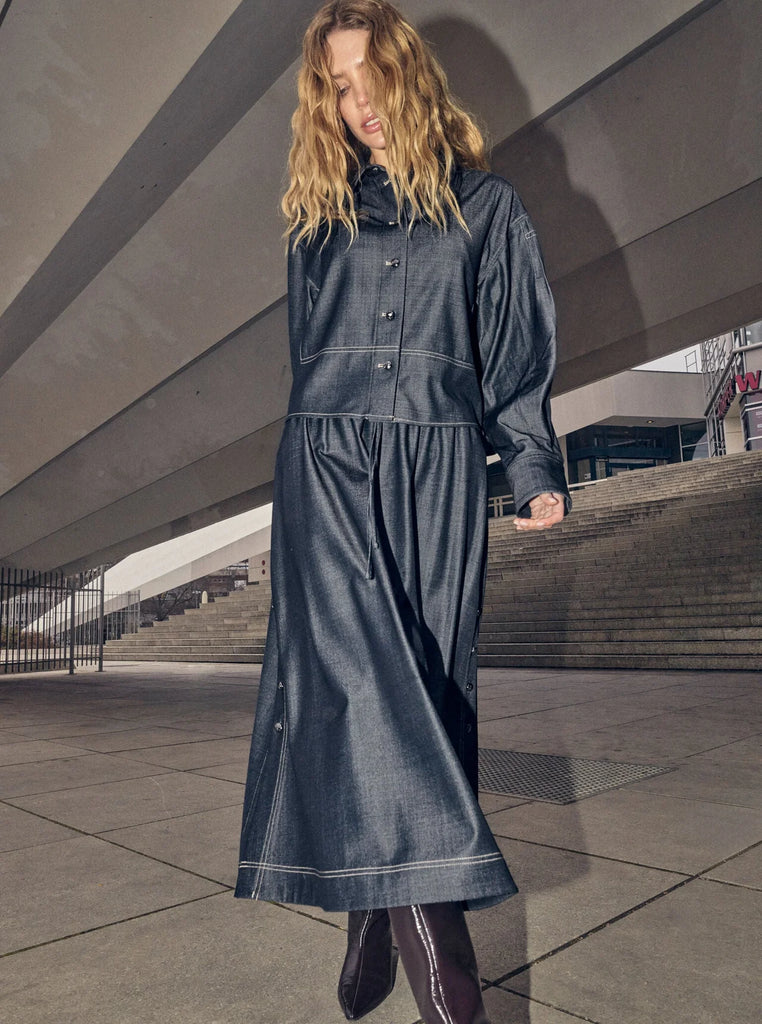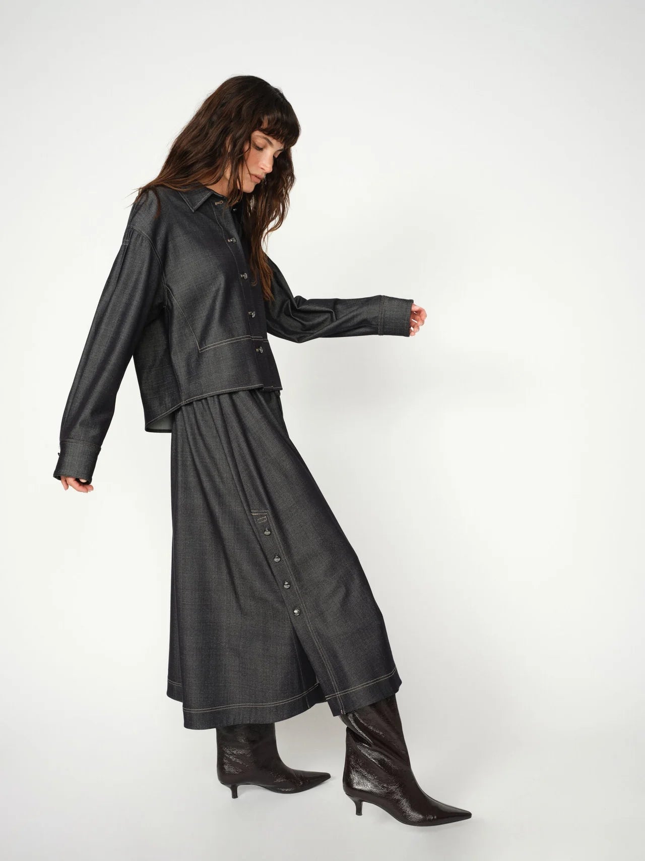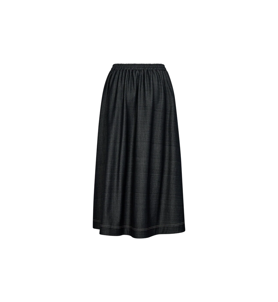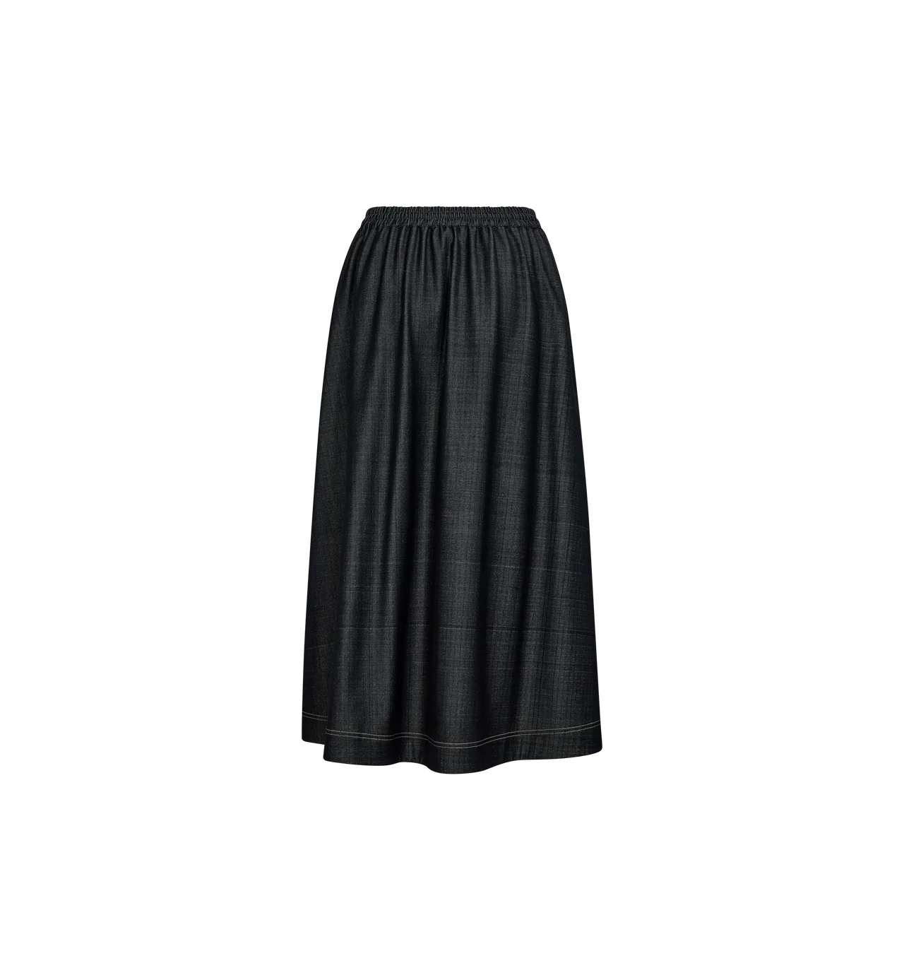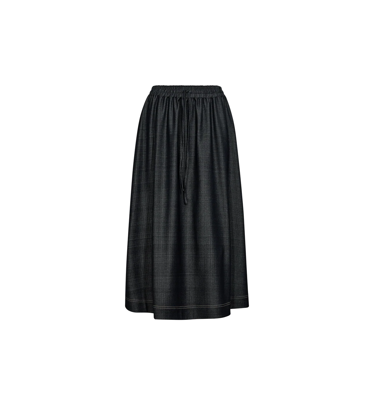 Denne stilfulde knælange nederdel er fremstillet af blødt denim med TENCEL™ Lyocell, der sikrer en åndbar og let følelse. Designet med en flatterende mellem/høj talje, har den en elastisk linning med justerbare snører for ultimativ komfort og perfekt pasform. Brug den med den matchende denimskjorte for et koordineret look eller style den med en afslappet t-shirt for et ubesværet hverdagsoutfit.
