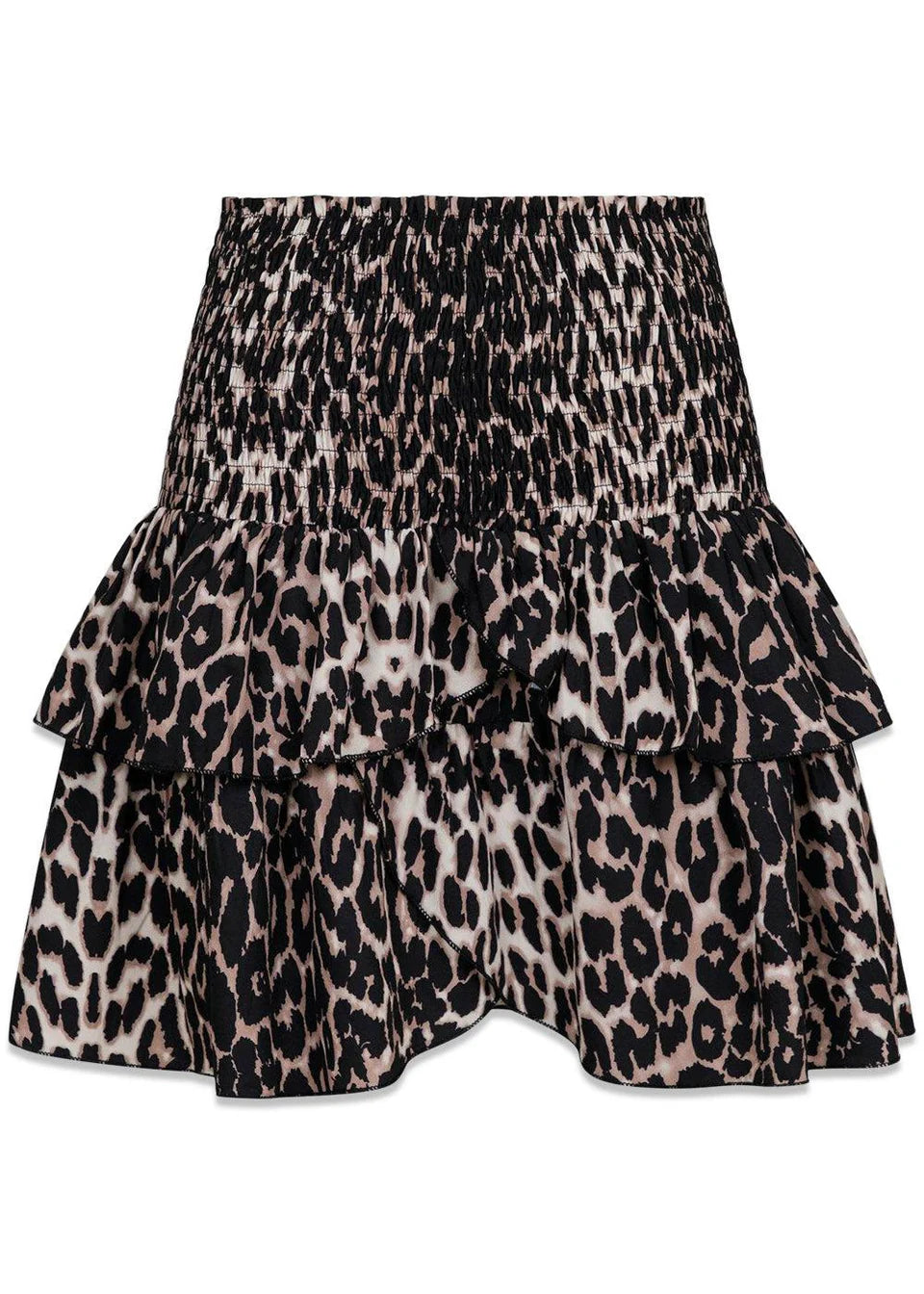 Sød kort nederdel med 2 lag flæser og slids foran. Taljen er med smock og elastik, og fittet er super komfortabel. Nederdelen kommer i et fint leopard print. Modellen er 176 cm og bærer en størrelse 36