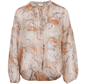 Fatima Exotic Flower skjorten fra Neo Noir er i et super fint print med cremefarvet/beige bund og blomsterprint i orange/lilla farver og en sølvtråd i lodrette striber. Skjorten har rund hals og knapper hele vejen ned bag en skjult knaplukning, hvor der også er læg på begge sider. Der er elastik i ærmekanten. Kvalitet er chiffon agtig og dermed let gennemsigtig.