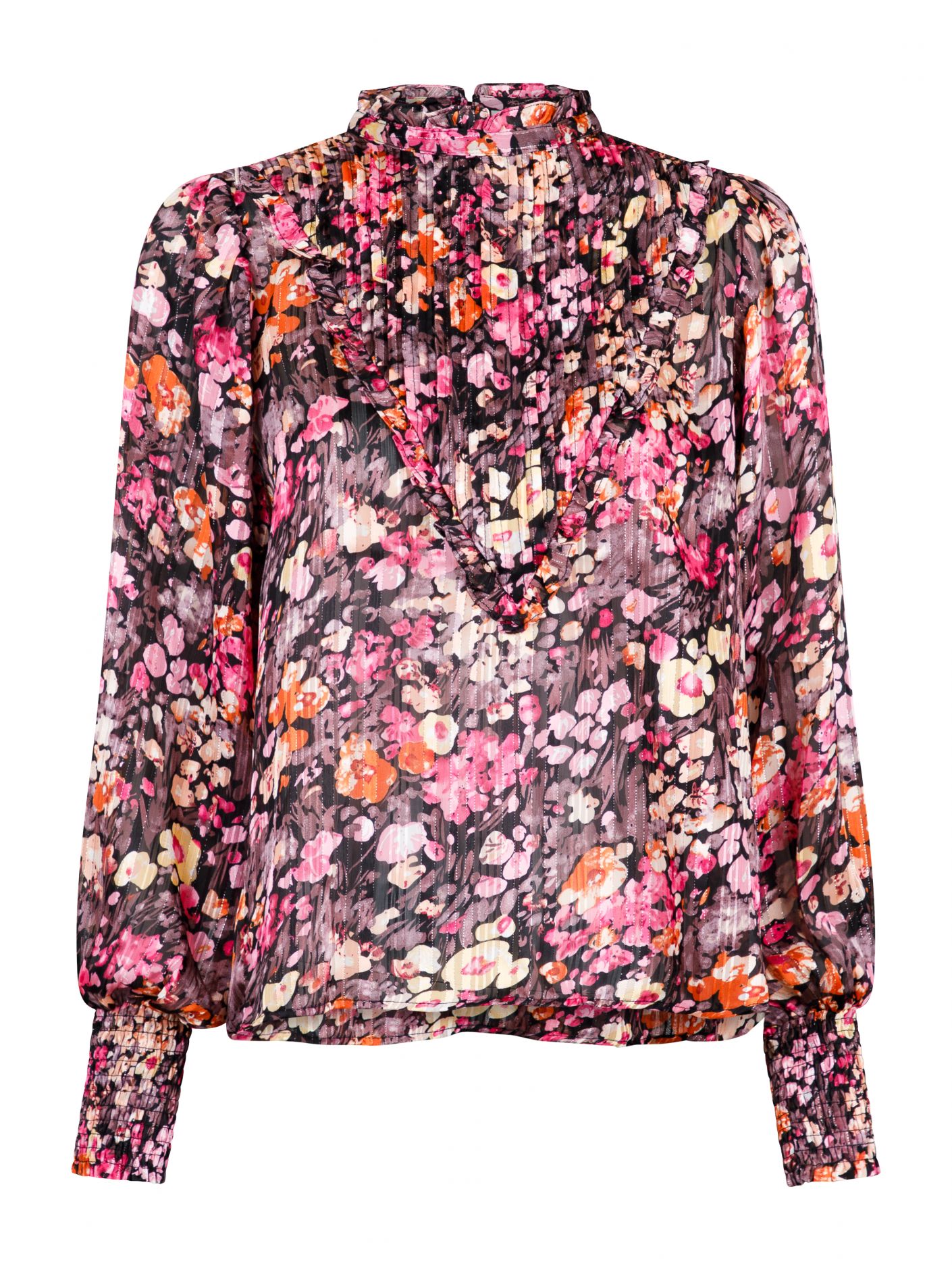 Smuk bluse med bisser og smock detaljer. Pasformen er løs og kommer i et farverigt print med lurex.