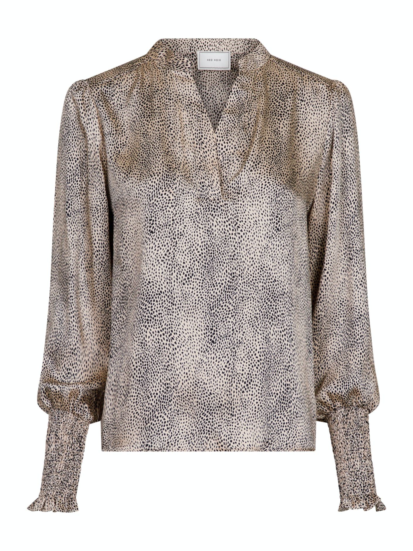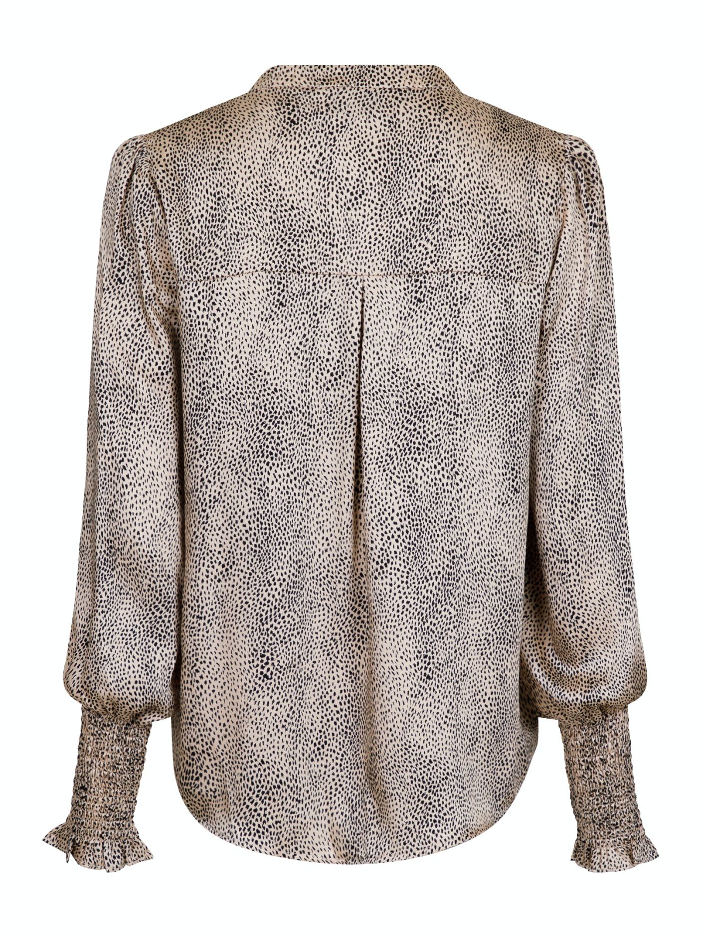 Klassisk skjorte bluse med dyb udskæring og smock detalje ved ærmet. Kvaliteten er en blød satin med et fint grafisk print.