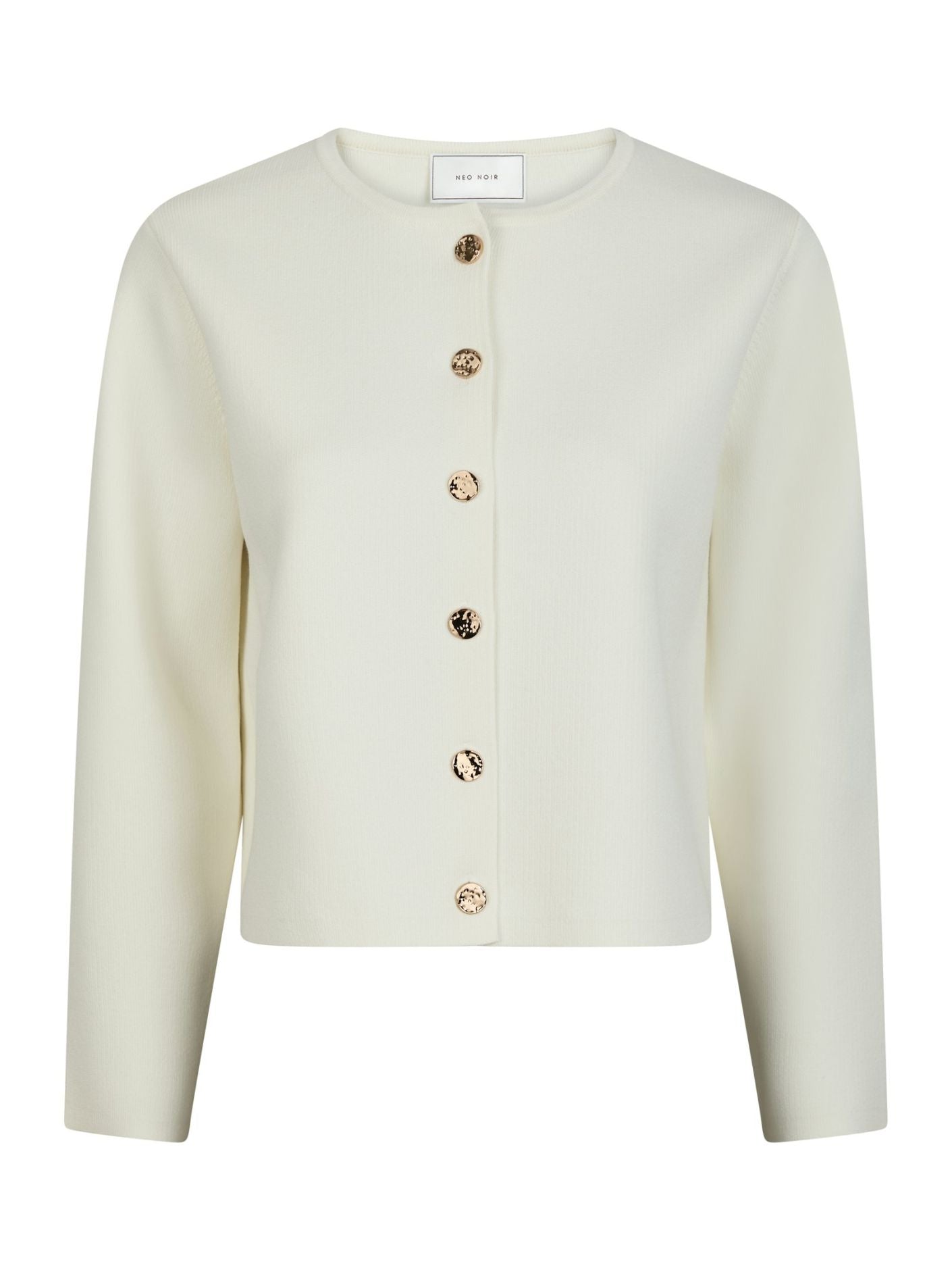 Klassisk strikket cardigan fra Neo Noir med guld knapper, i en lækker, blød kvalitet. Cardiganen har en lige pasform og rund hals.