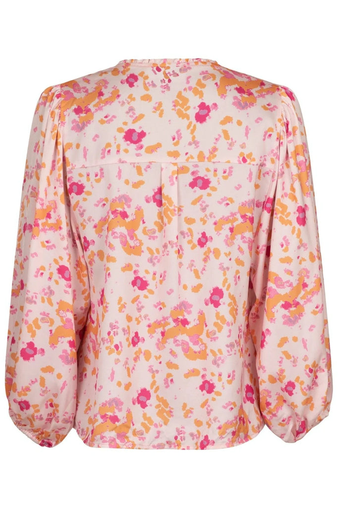 Sød bluse med volume i ærmerne og en fin binde detalje på brystet og v-udskæring. Blusen kommer i et fint lyserødt grafisk print.