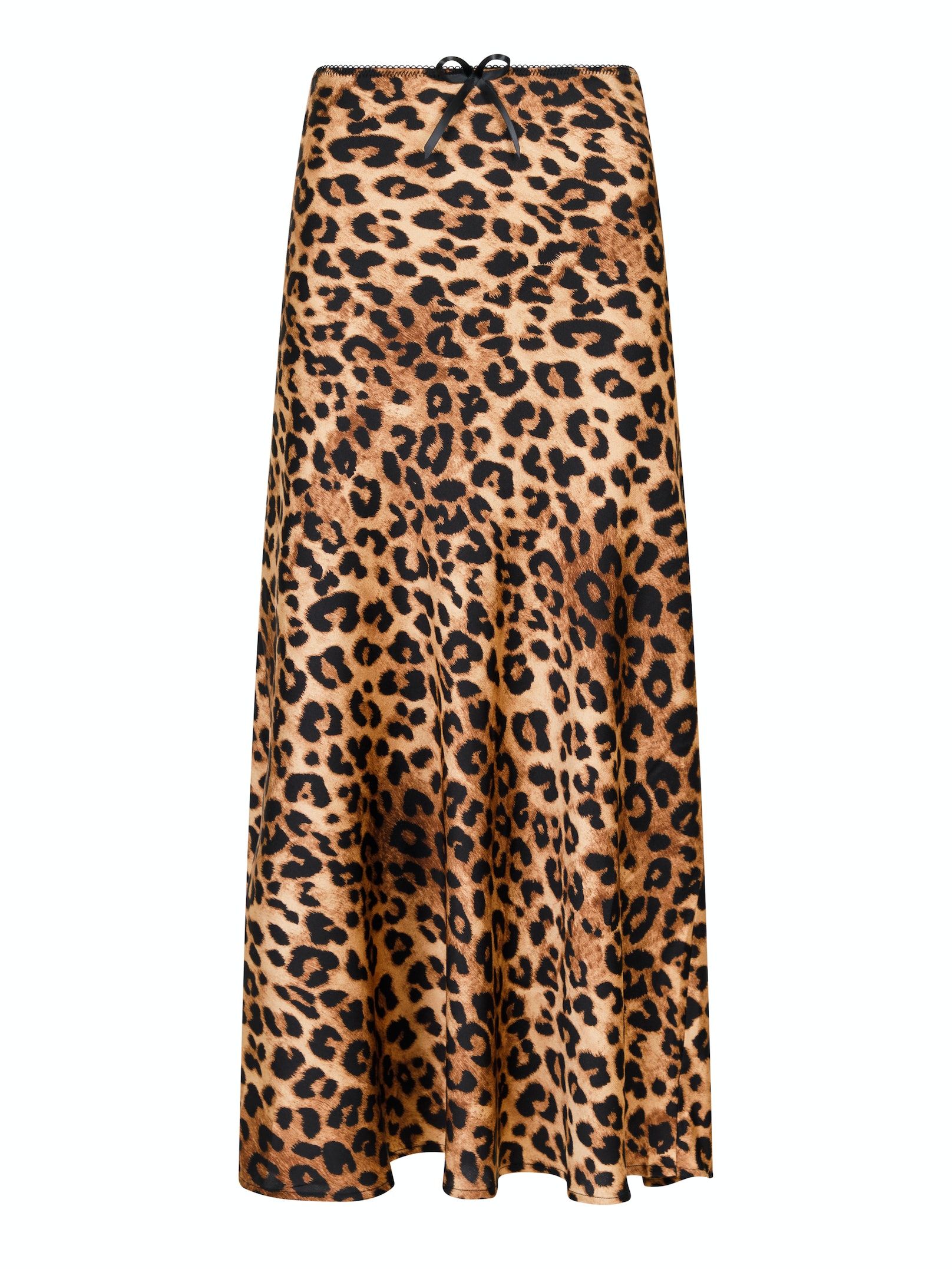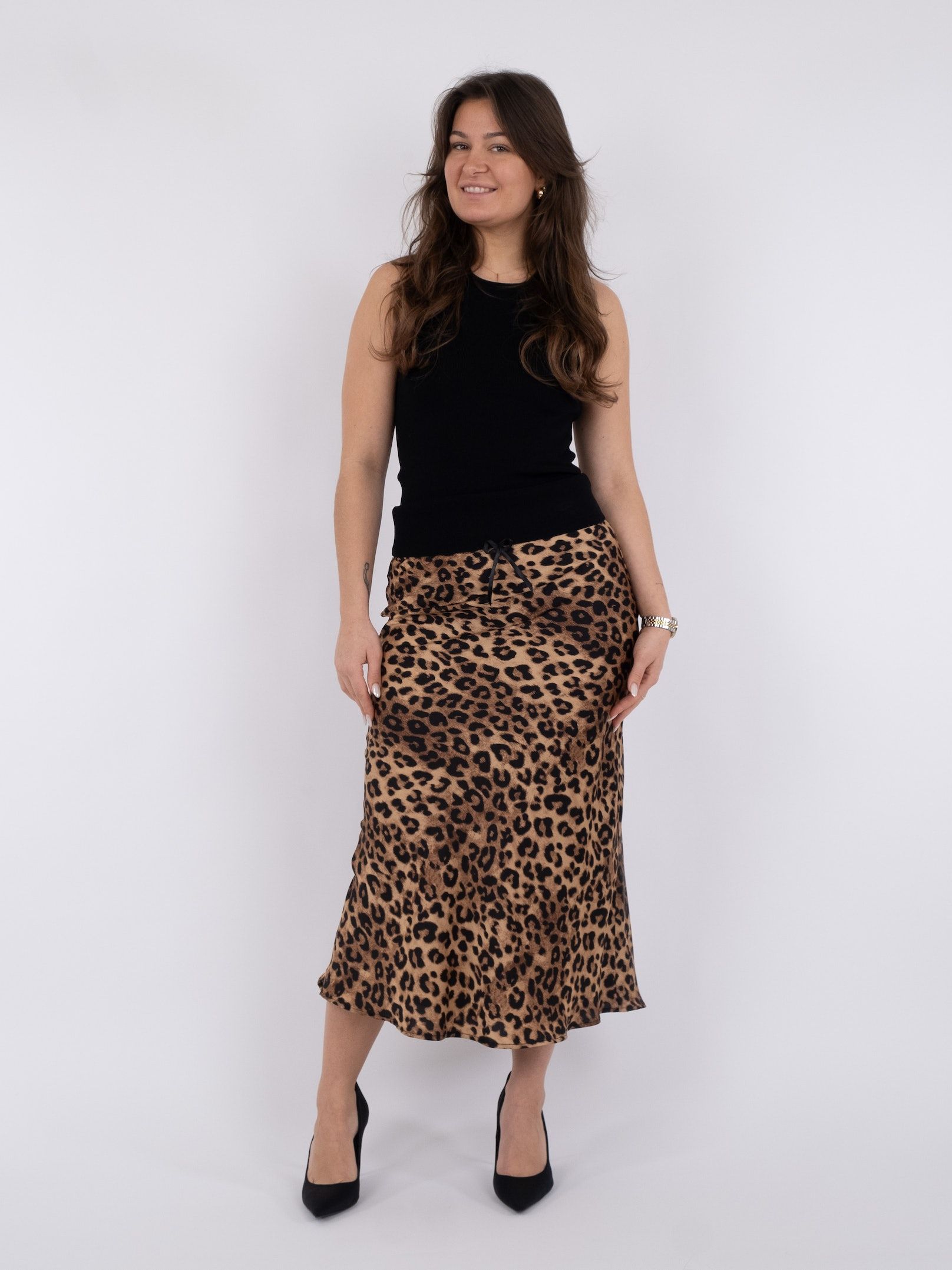 Lang nederdel med elastik indvendig i taljen fra Neo Noir. Nederdelen er skåret på skrå og følger kroppen og falder smukt. Kvaliteten er en lækker blød satin og i et smukt leopardprint.