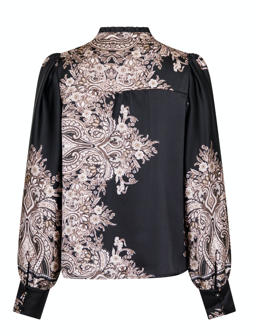 Feminin bluse i en smuk satin kvalitet fra Neo Noir. Blusen har lange ærmer og går ned i et V foran med dekorative knapper.