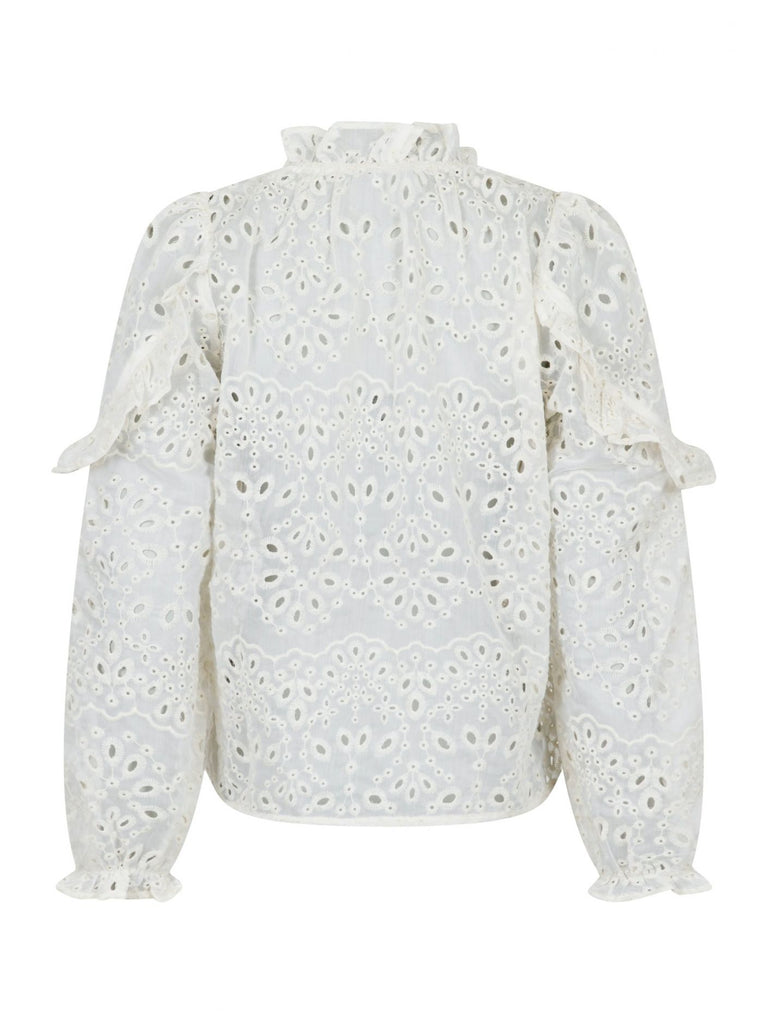 Feminin bluse i smuk broderet kvalitet. Ærmerne har volume med flæser og høj halsudskæring. Modellen er 176 cm og bærer en størrelse 36.