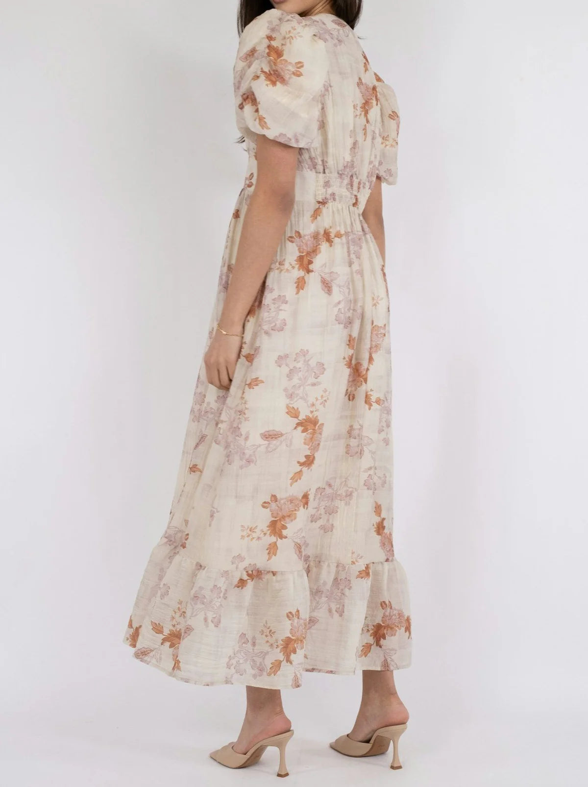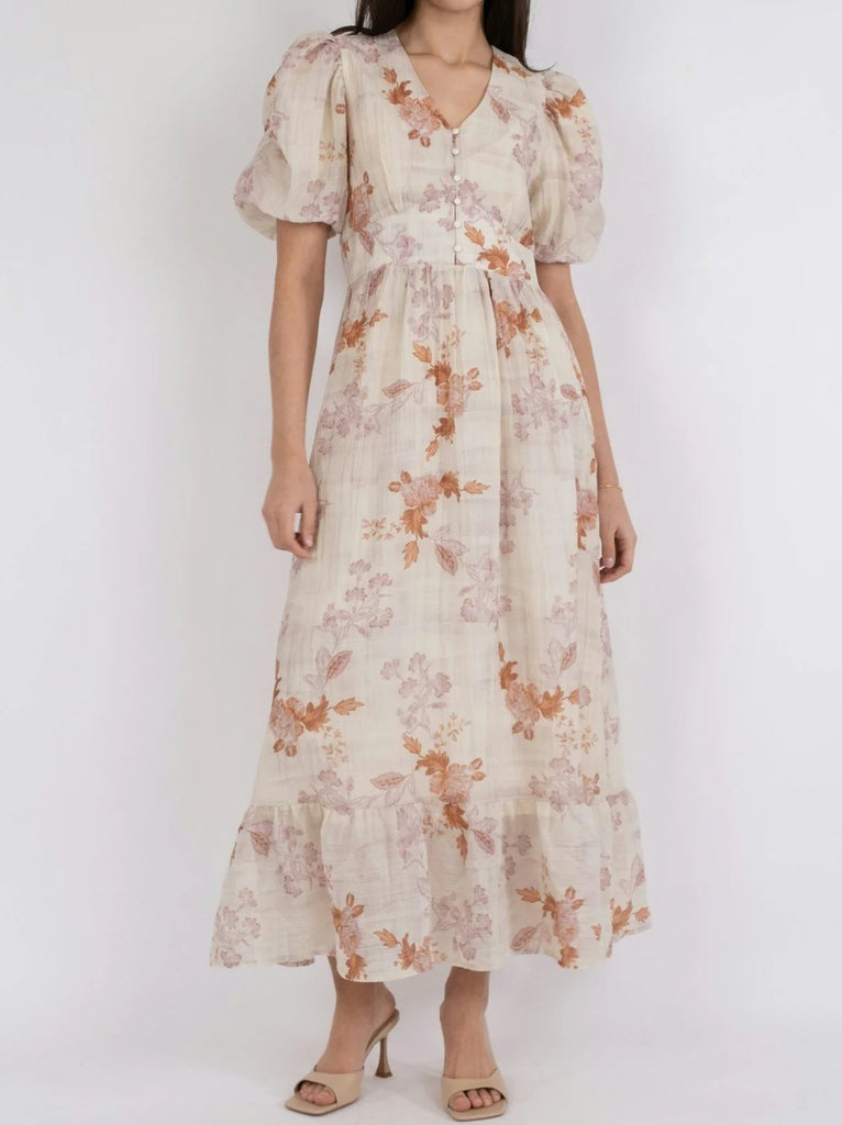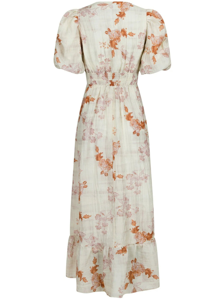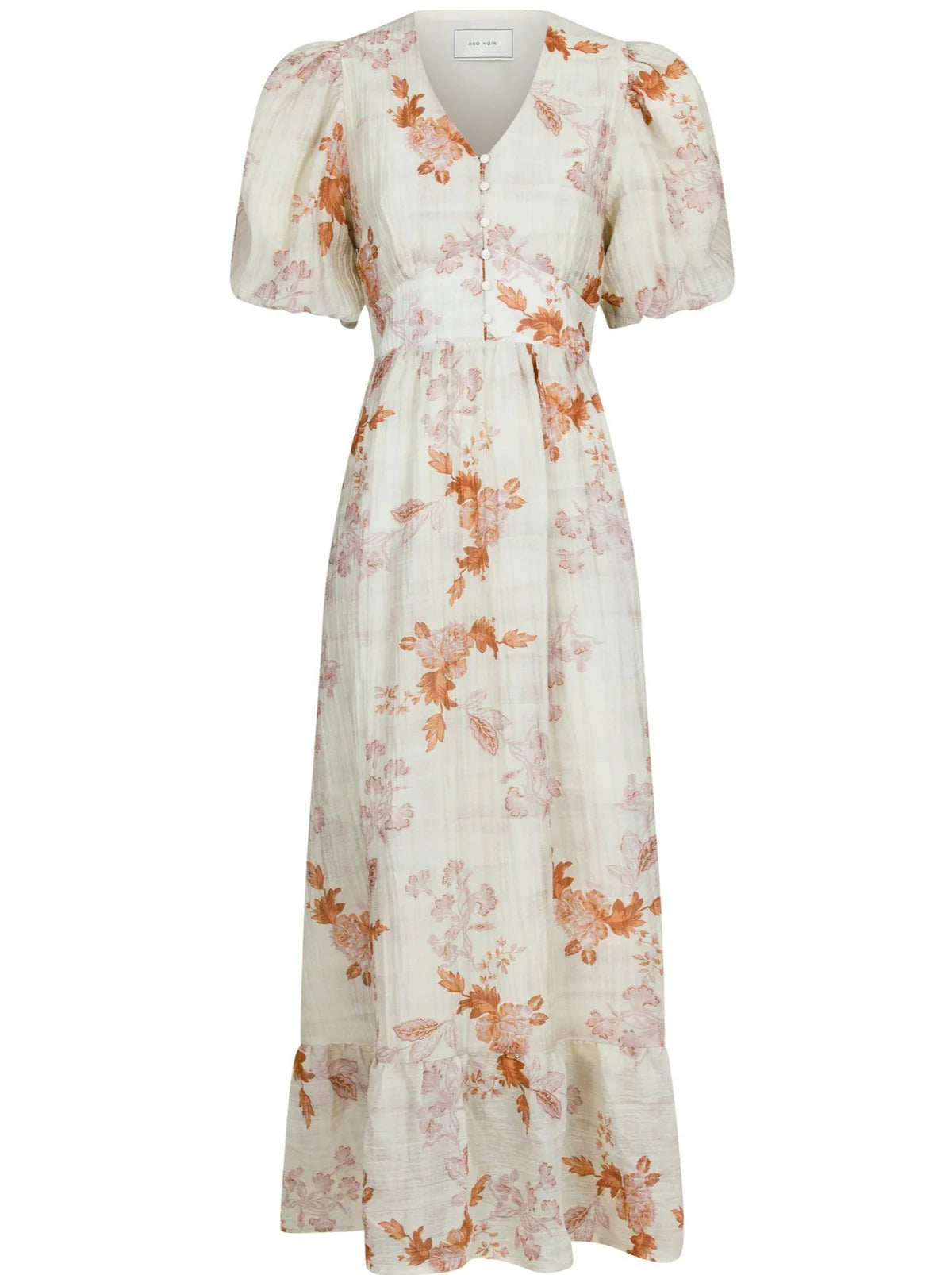 Smukkeste kjole fra Neo Noir. Kjolen falder smukt og tungt. Den er desuden ikke gennemsigtig, da der er to lag stof. Kjolen er detaljeret med betrukne knapper, v-hals, puffede ærmer, elastik bagi taljen. Kjolen er sådan set et perfekt bud på en kjole der både kan bruges til hverdag og festlige anledninger.