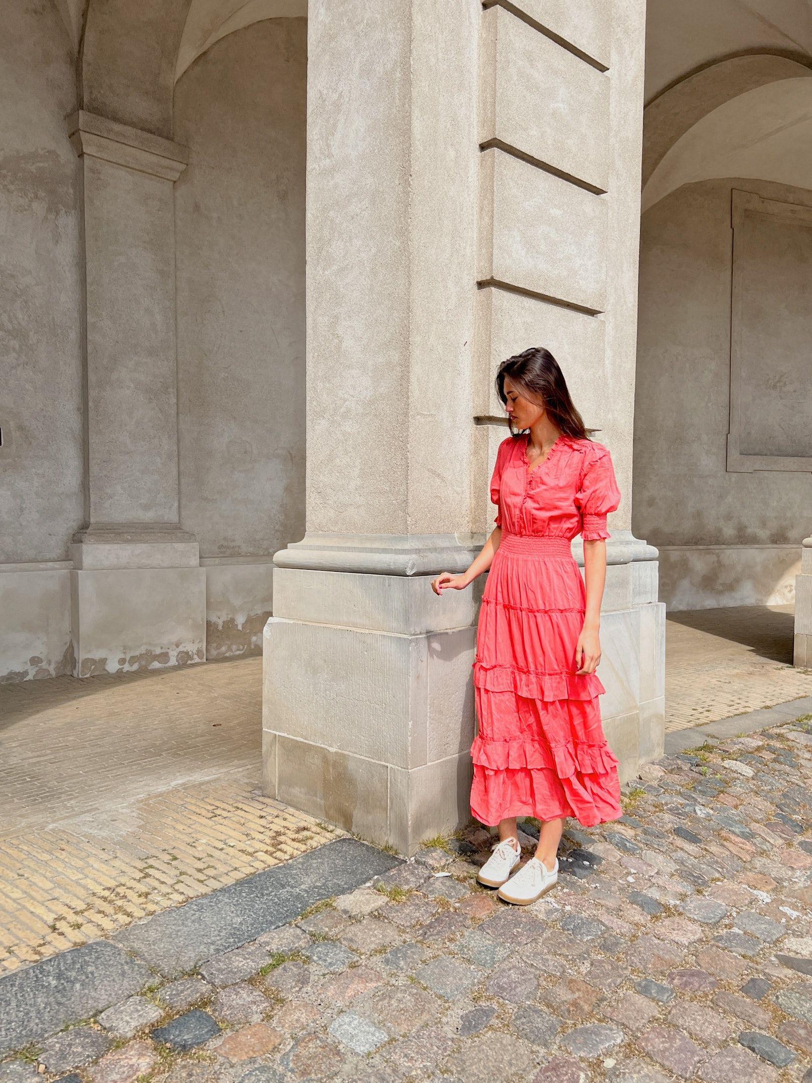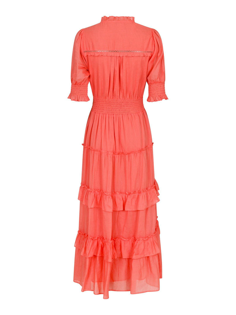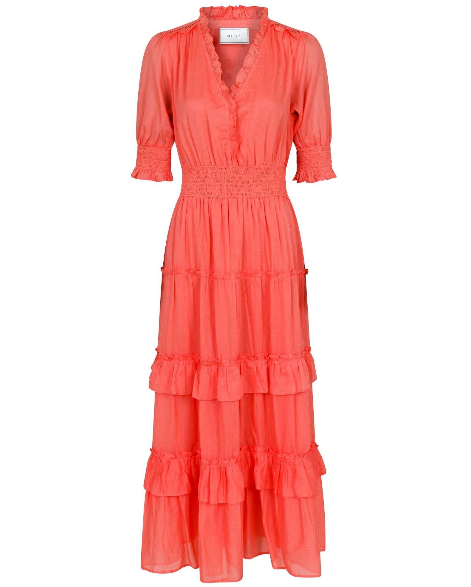 Denne smukke koralfarvet kjole fra Neo Noir er lavet af en blød og let bomulds voile, der er behagelig at have på og som føles let og luftig mod huden. Den smukke kjole har smock i taljen, som er designet til at tilpasse sig din krop og give dig en smigrende silhuette. Den er desuden fantastisk behagelig at have på. Øverst har kjolen en smuk v-udskæring og fine pufærmer med smock for enden. Den har desuden de fineste flæsedetaljer ned ad skørtet.