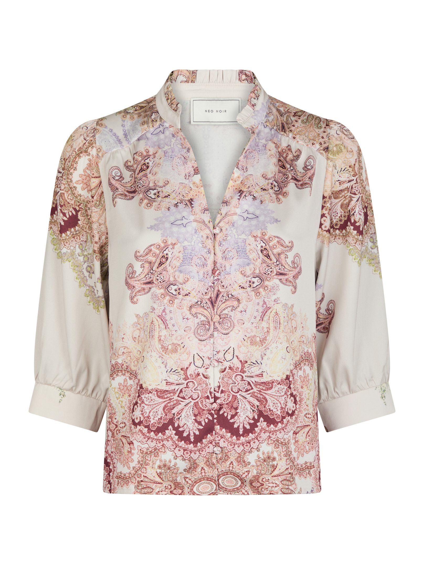 Feminin bluse med et smukt paisley print fra Neo Noir. Blusen har 3/4 ærmer og går ned i et V foran med dekorative knapper. Pasformen er løs men feminin.
