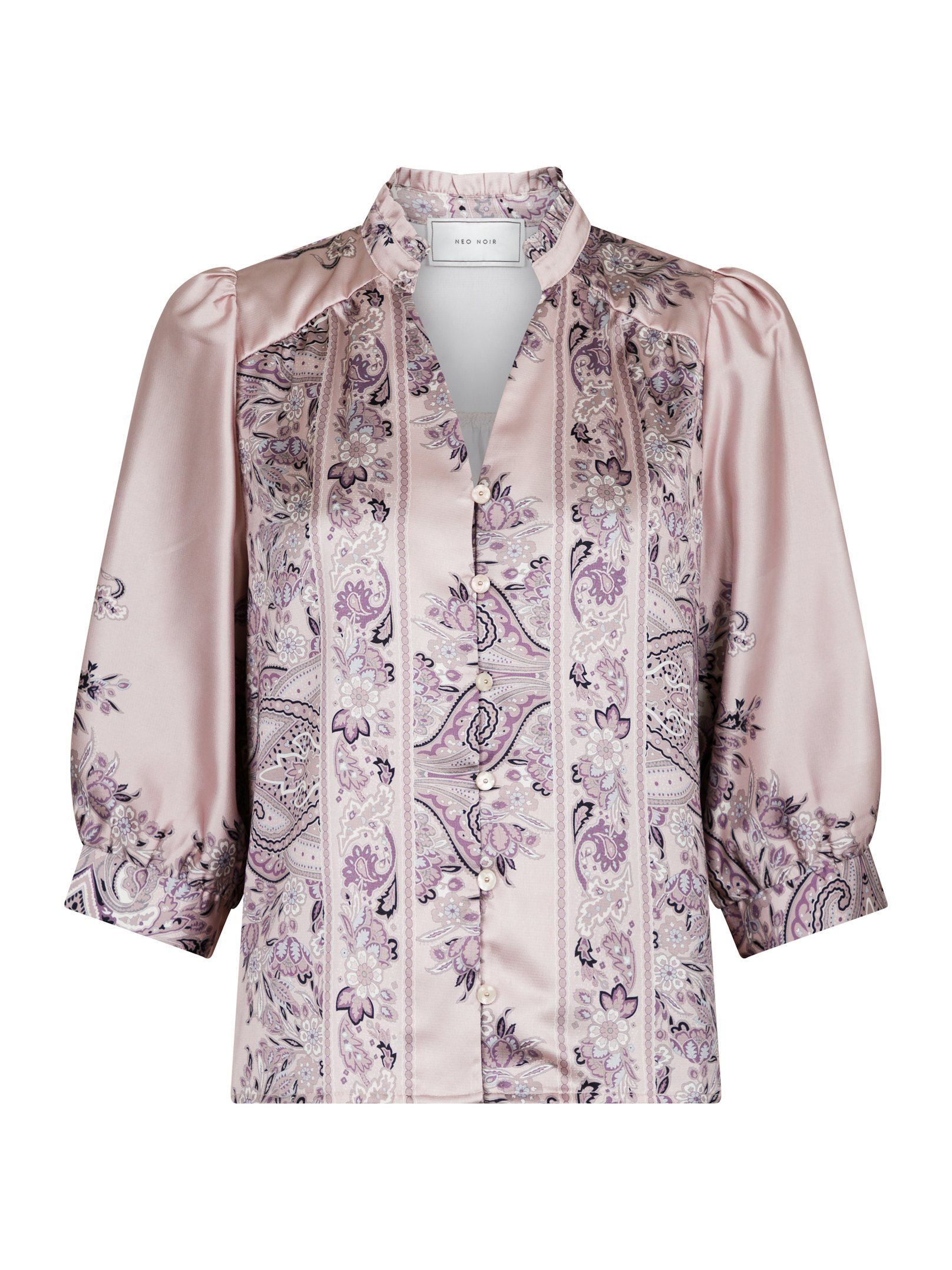 Feminin bluse med et smukt paisley print fra Neo Noir. Blusen har 3/4 ærmer og går ned i et V foran med dekorative knapper. Pasfoemen er løs men feminin.