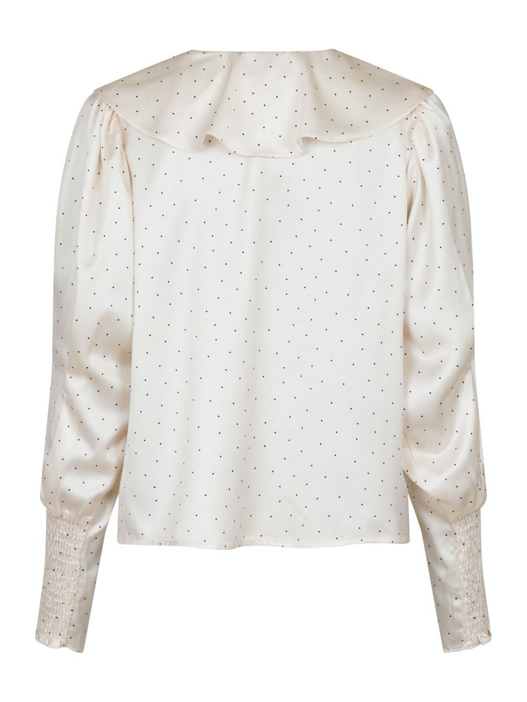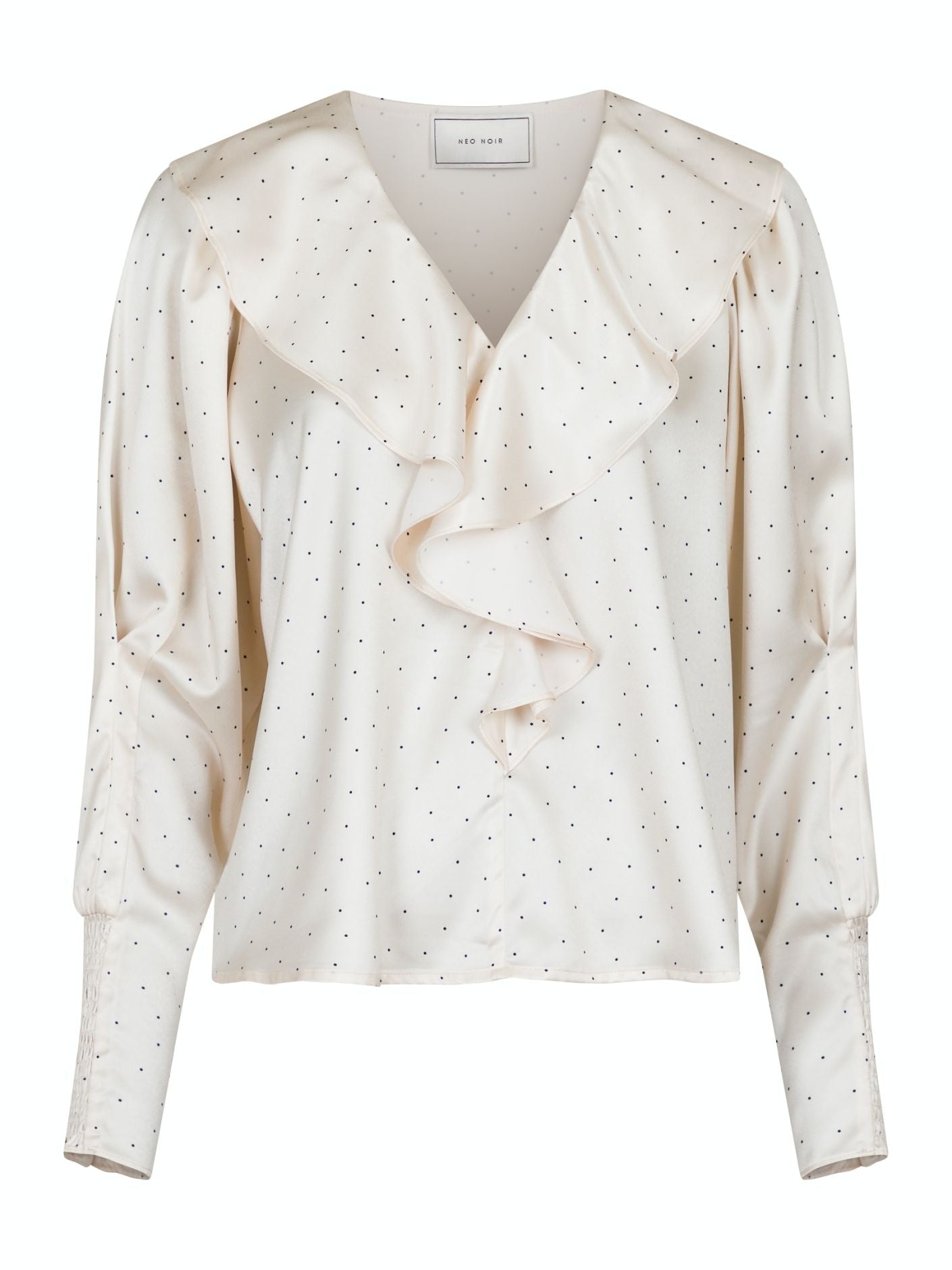 Feminin bluse med volant krave, i en blød satin fra Neo Noir. Pasformen er løs men feminin og ærmerne er afsluttet med blød smock.