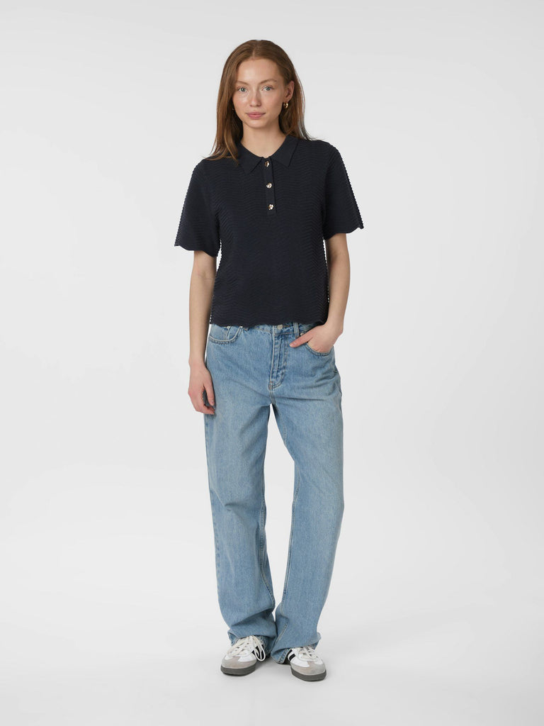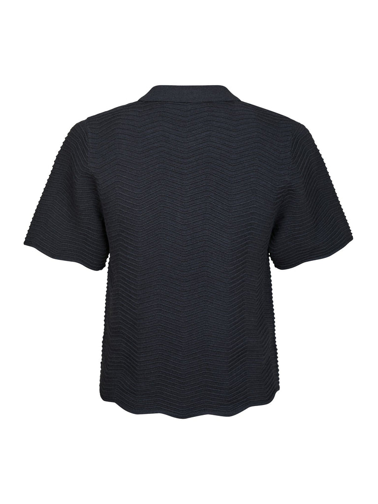 Sød strikket t-shirts polo med krave og bølget detaljer. Den blødeste kvalitet med masser af stræk i kvaliteten. Strikken har de smukkeste guldknapper så den både kan bruges helt lukket og åbnet lidt op i halsen.