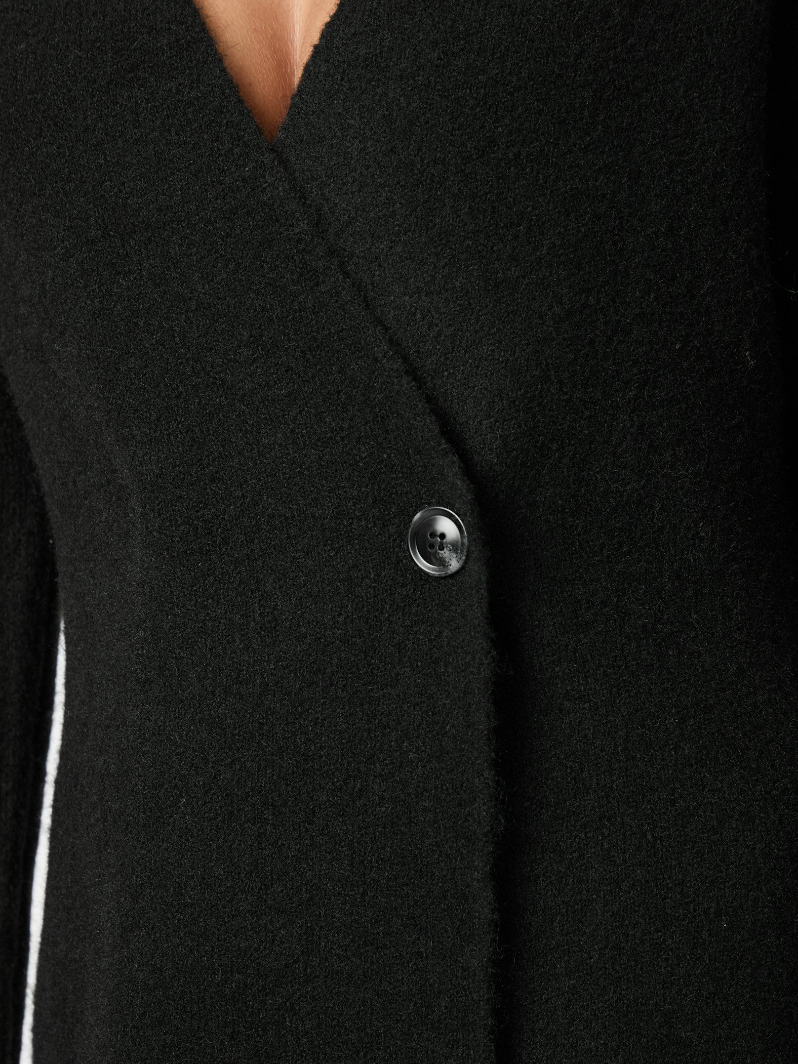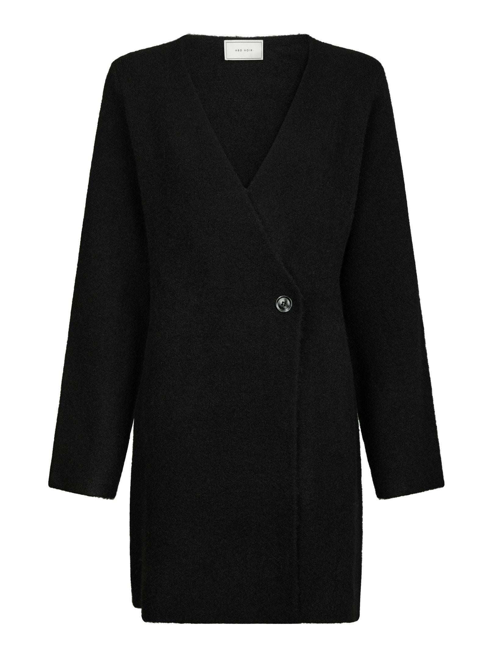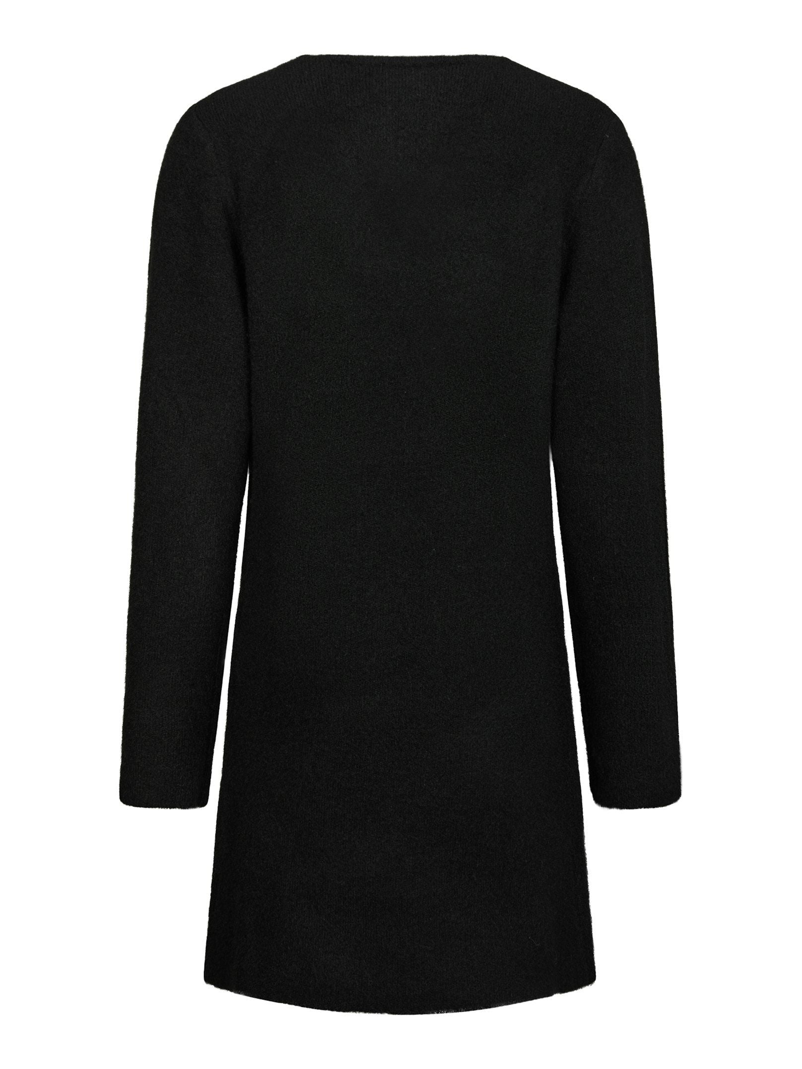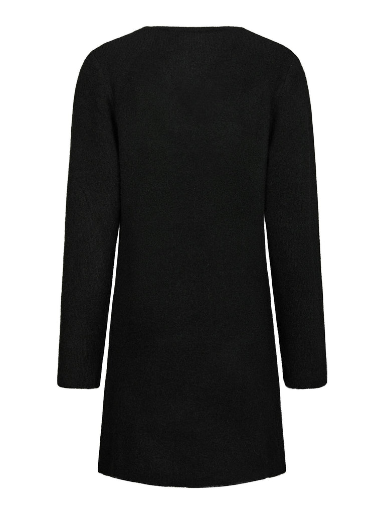 Cool strikkjole, som kommer i en blød kvalitet. Kjolen har en timeglas figur i form af slå-over effekt lukket med en knap. Modellen er 176 cm og bærer en størrelse 36.