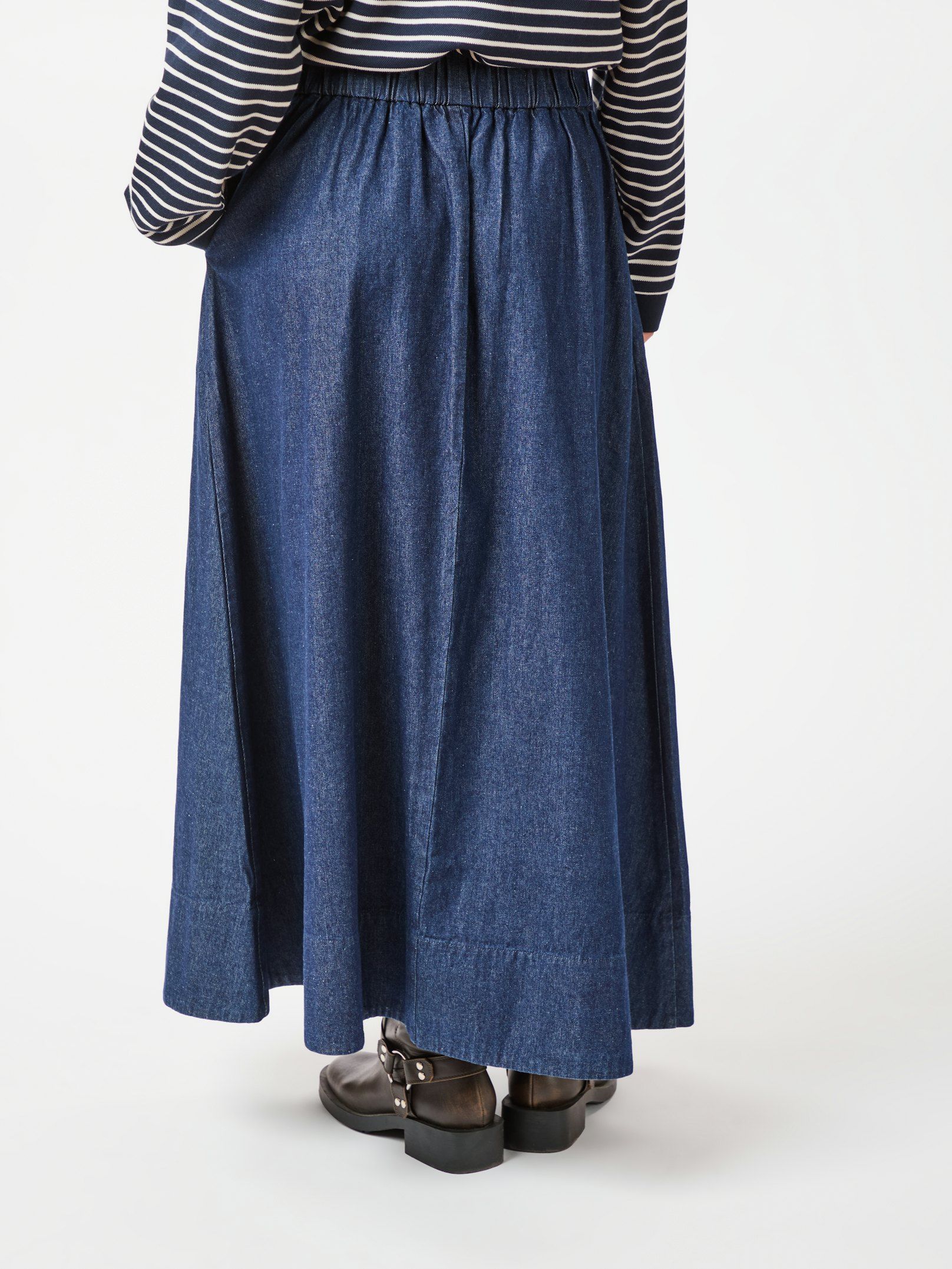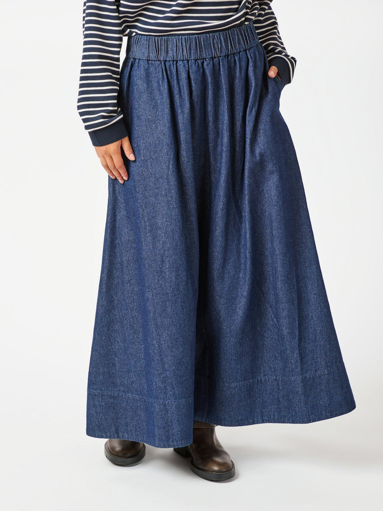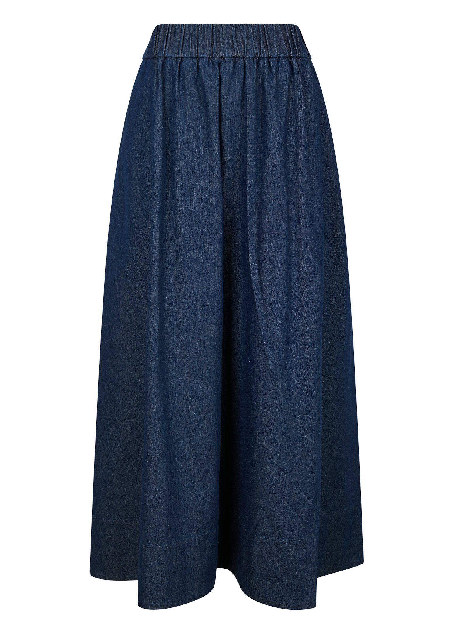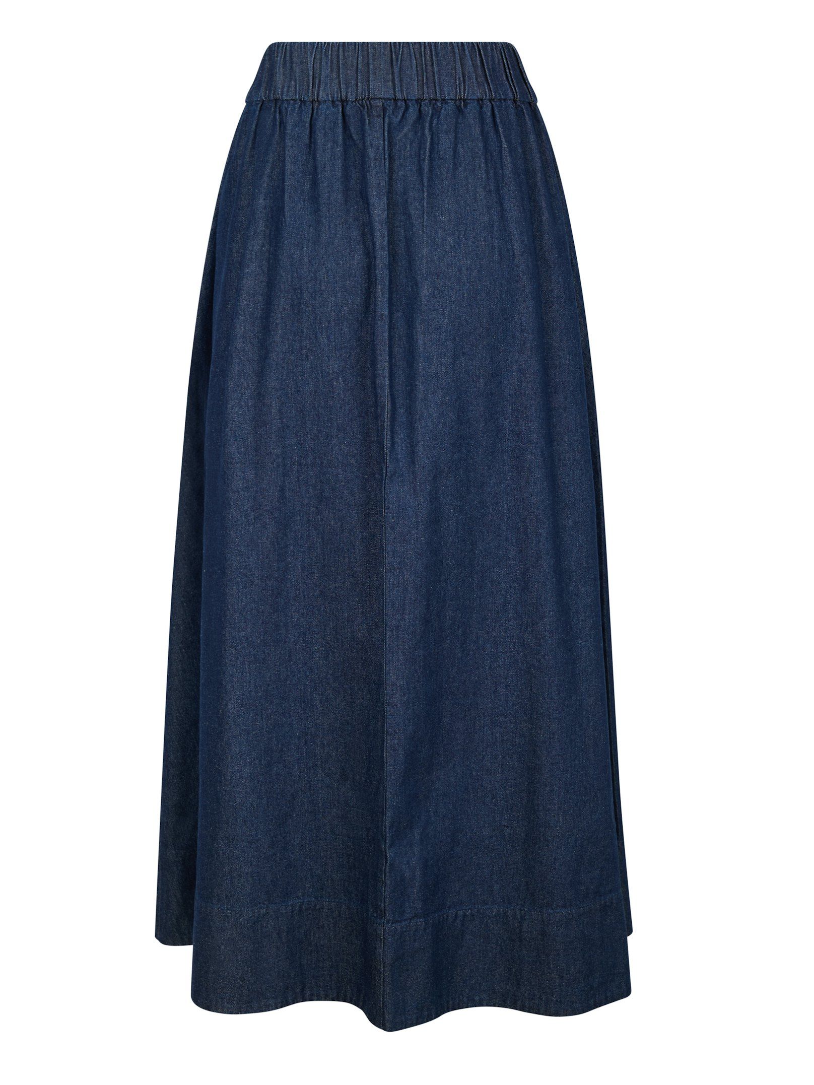 Cool lang denimnederdel fra Neo Noir i en blød denimkvalitet. Nederdelen har en høj blød elastik i taljen, lommer og vidde i bunden. Længden stopper lige over anklen.