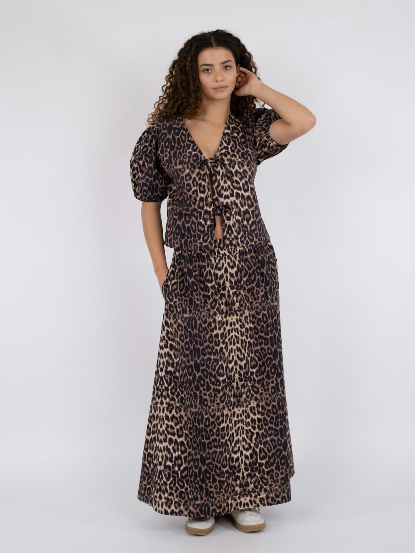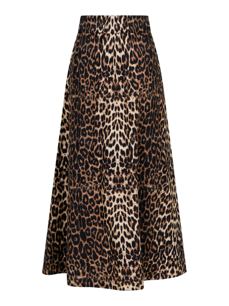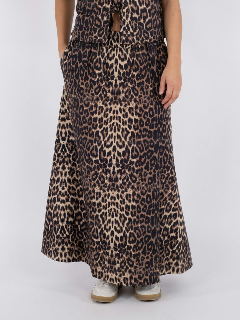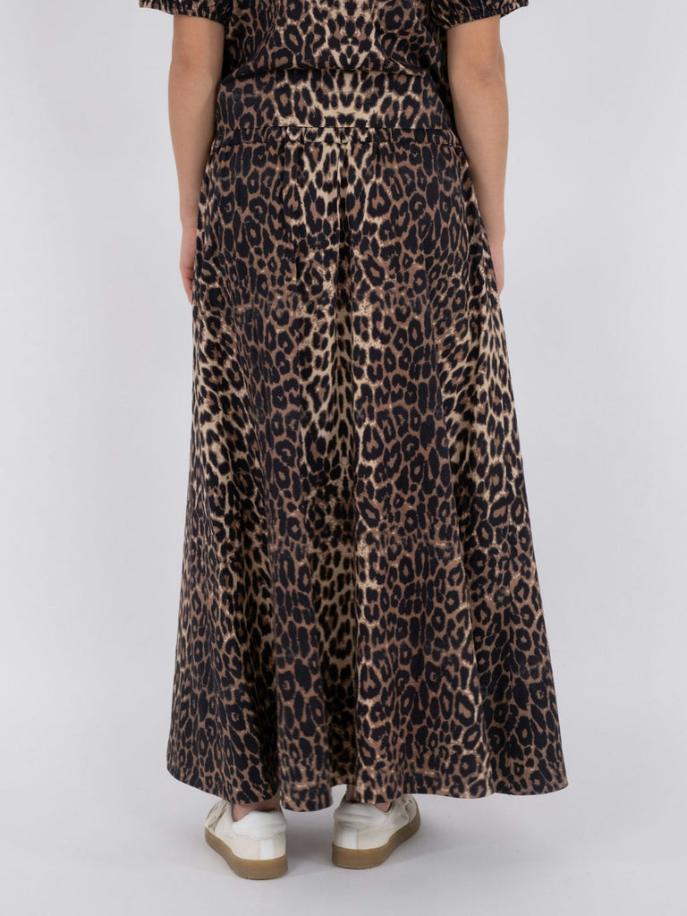 Nederdel i bomuldspoplin med leo print. Nederdelen har en høj blød elastik i taljen, lommer og vidde i bunden. Længden stopper lige over anklen.