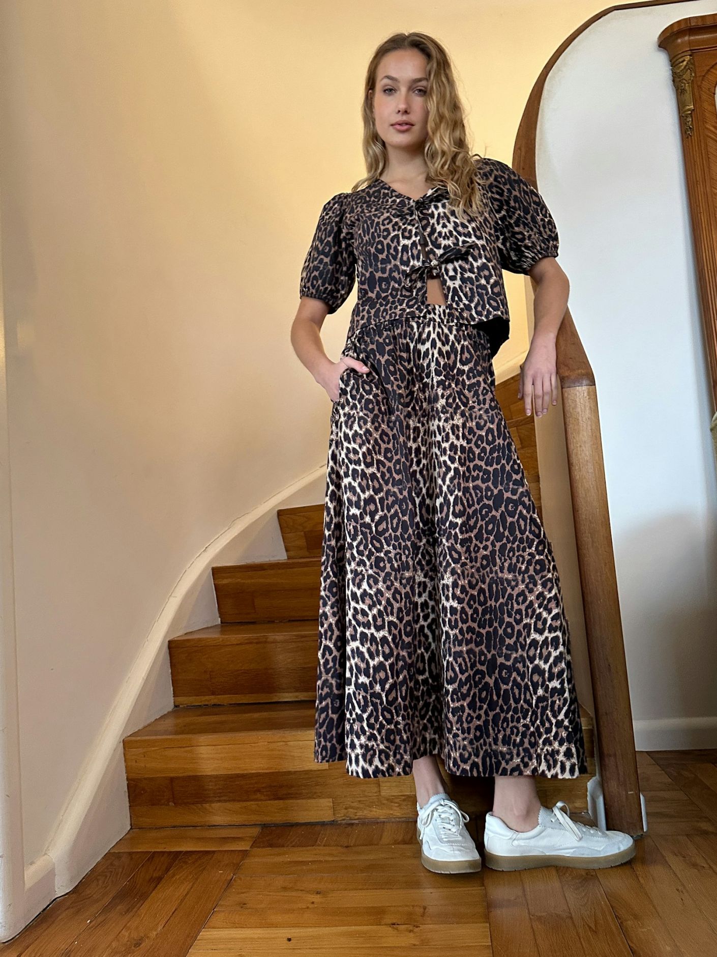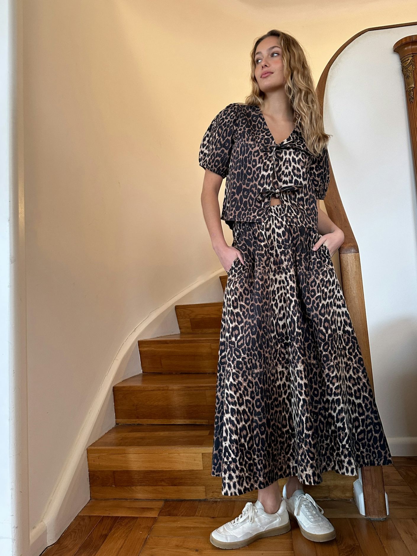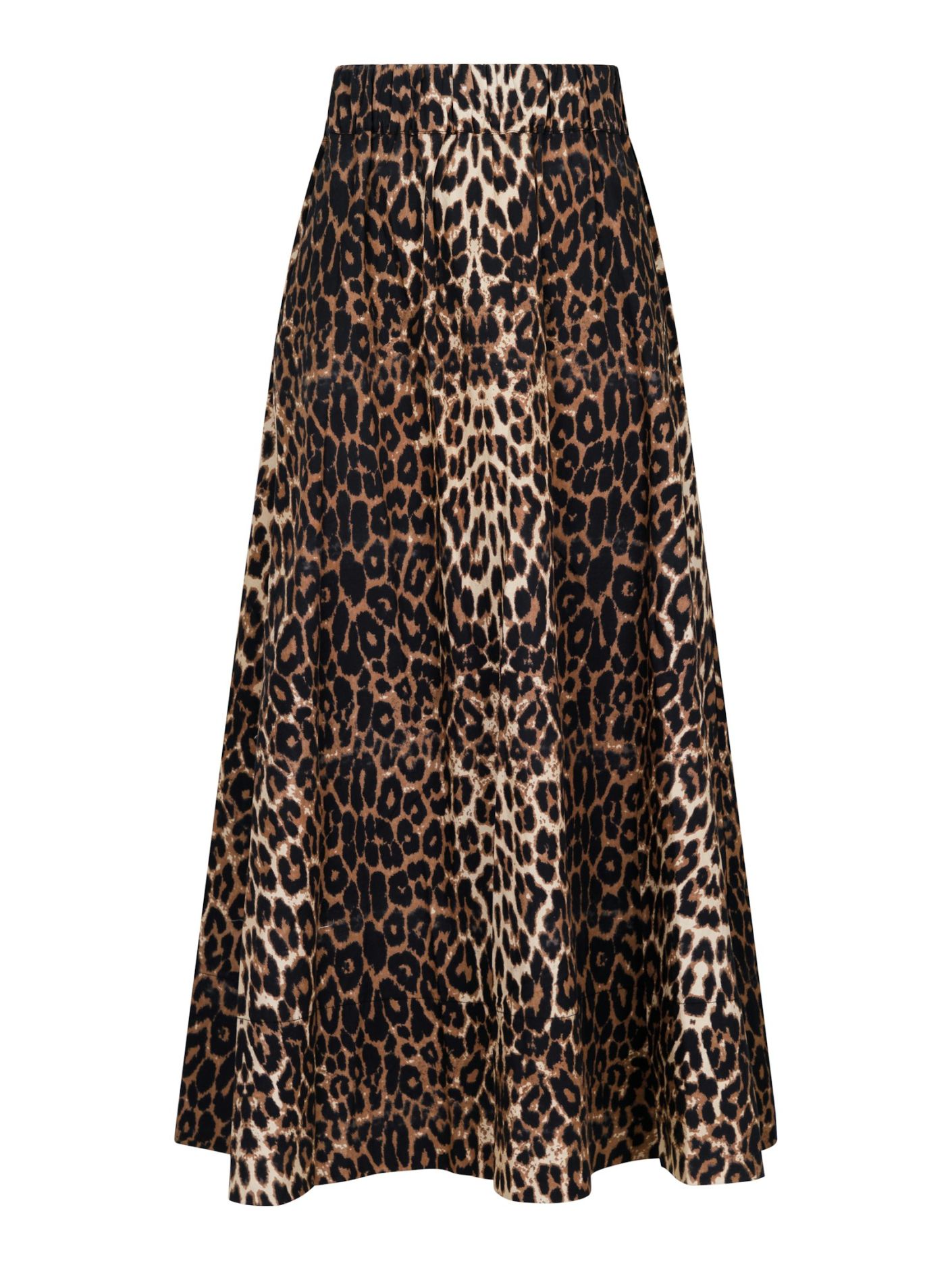 Nederdel i bomuldspoplin med leo print. Nederdelen har en høj blød elastik i taljen, lommer og vidde i bunden. Længden stopper lige over anklen.