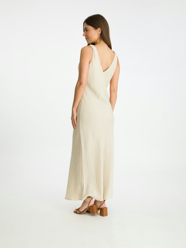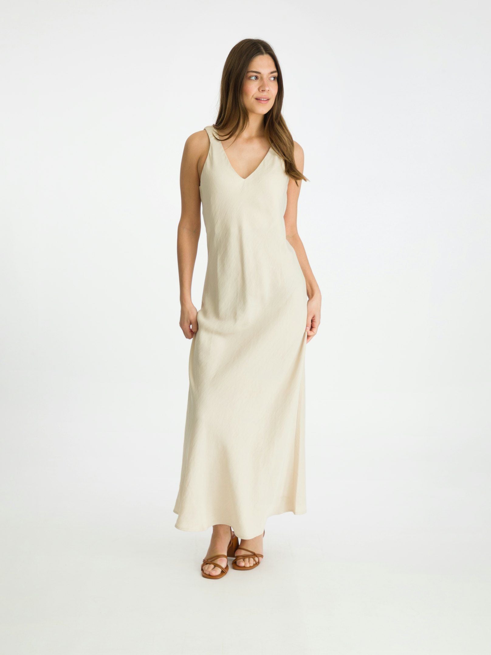 Lang kjole med strop detalje fra Neo Noir. Kjolen er i en fin kraftig kvalitet med struktur.